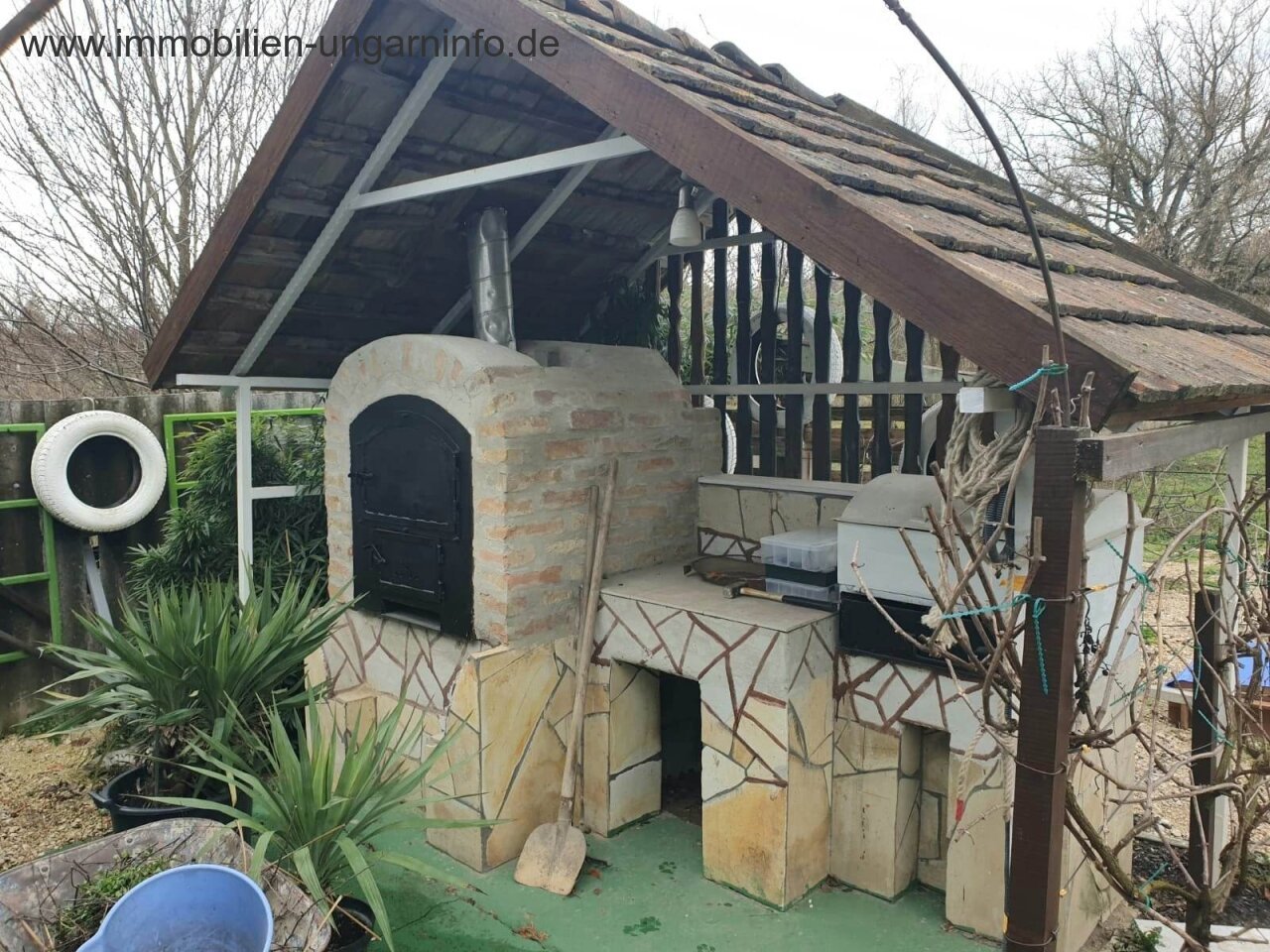 Im Hof gibt es eine Außenküche mit Grill, Ofen, Kochstelle, Garten-Essgeschirr. Der Hof ist grasbewachsen und ordentlich.