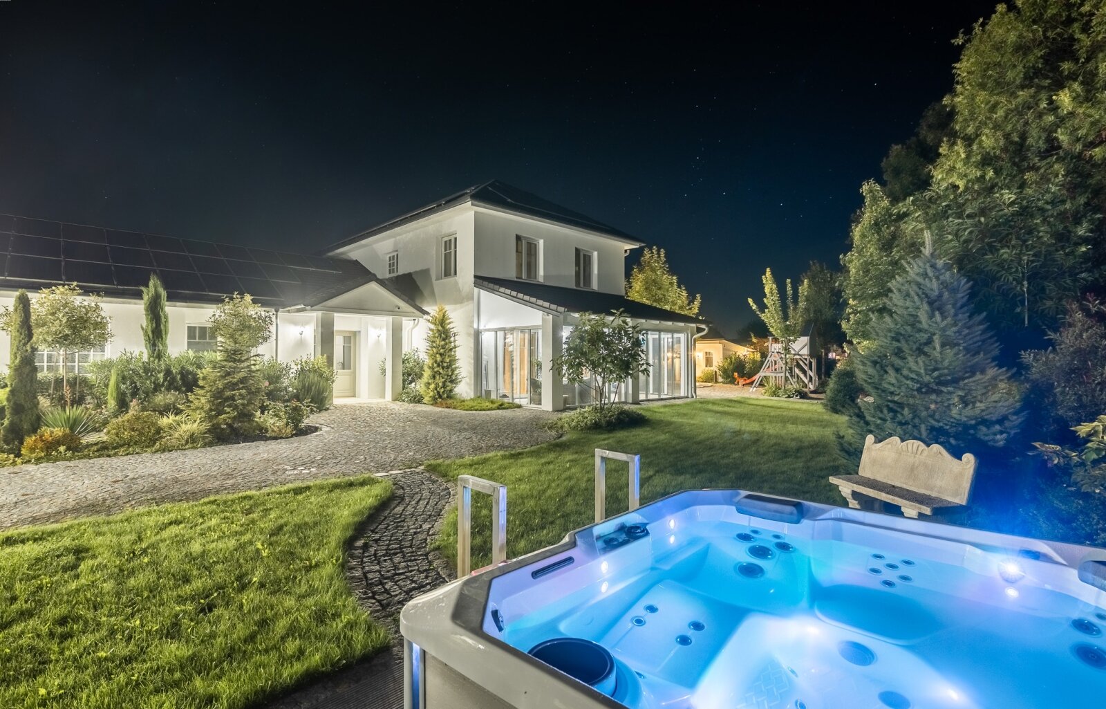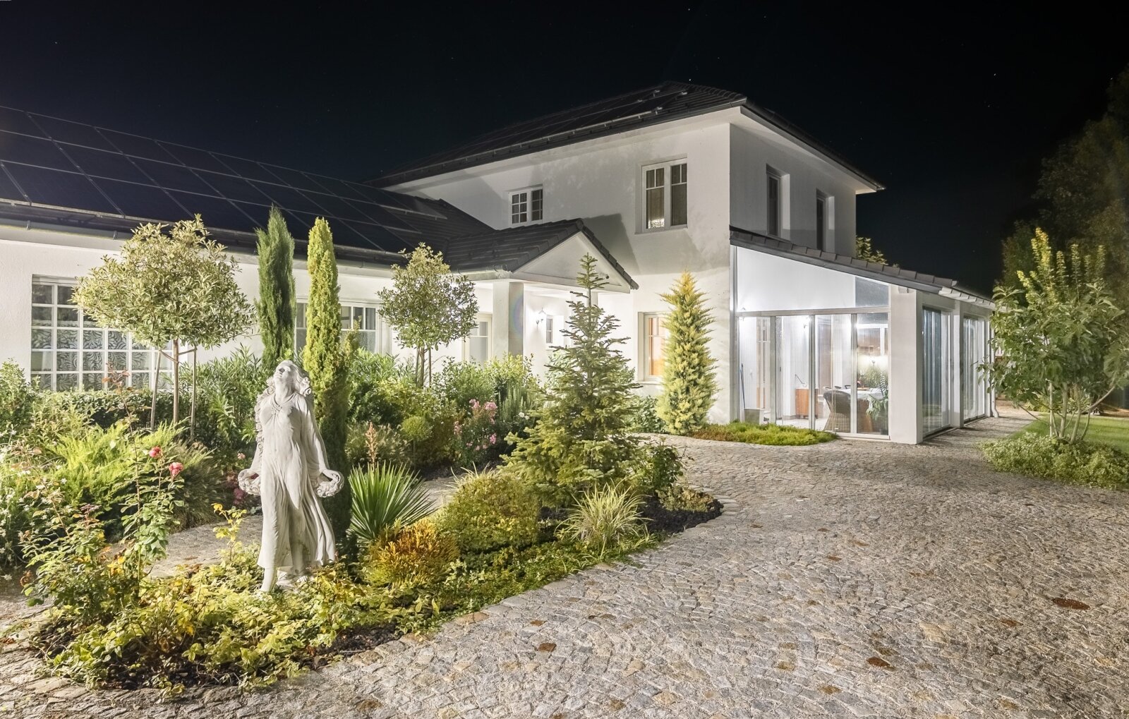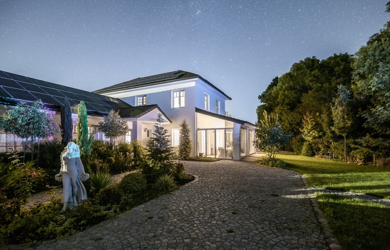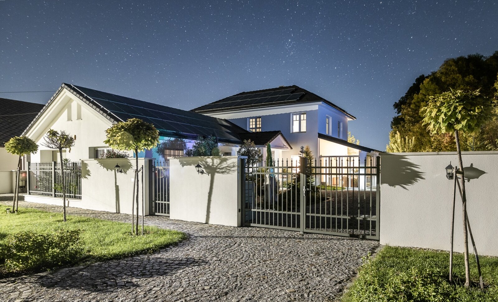 Die Immobilie wird über Fußbodenheizung beheizt (zusätzliche Handtuchtrockner in den Badezimmern), die Warmwasserversorgung erfolgt über eine Luft-Wasser-Wärmepumpe von Panasonic mit einem 1000-Liter-Pufferspeicher, und die Dächer sind mit 52 Solar Paneelen (16 kW-System) ausgestattet, die in mehreren Ausrichtungen verteilt sind und jährlich etwa 18 000 kW Strom erzeugen.