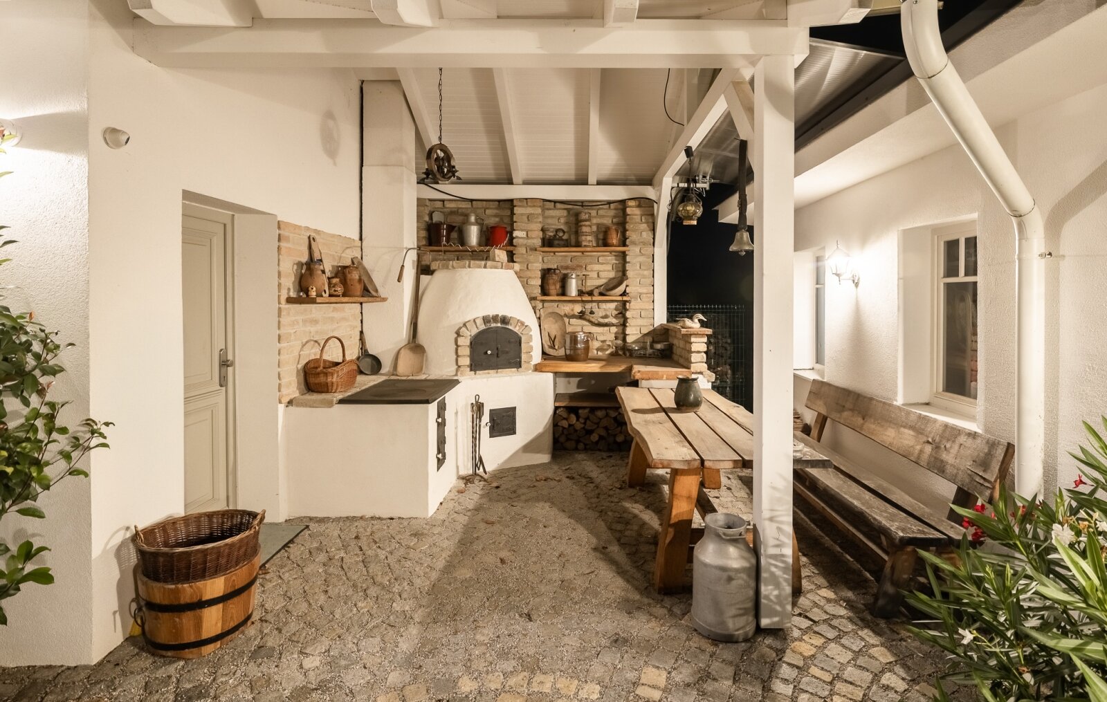 Die Räumlichkeiten des Hauptgebäudes sind im Erdgeschoss: Eingang + geräumige Diele, Küche + Esszimmer , Waschküche, Heizungsraum, Kellerluke, Garage, Wohnzimmer, Treppenhaus (darunter befindet sich ein Holzlager), Gäste-WC mit Handwaschbecken, Bad mit Dusche, Gästezimmer, Fitnessraum, hintere Küche (Sommerküche)