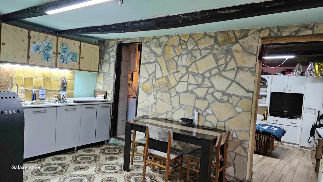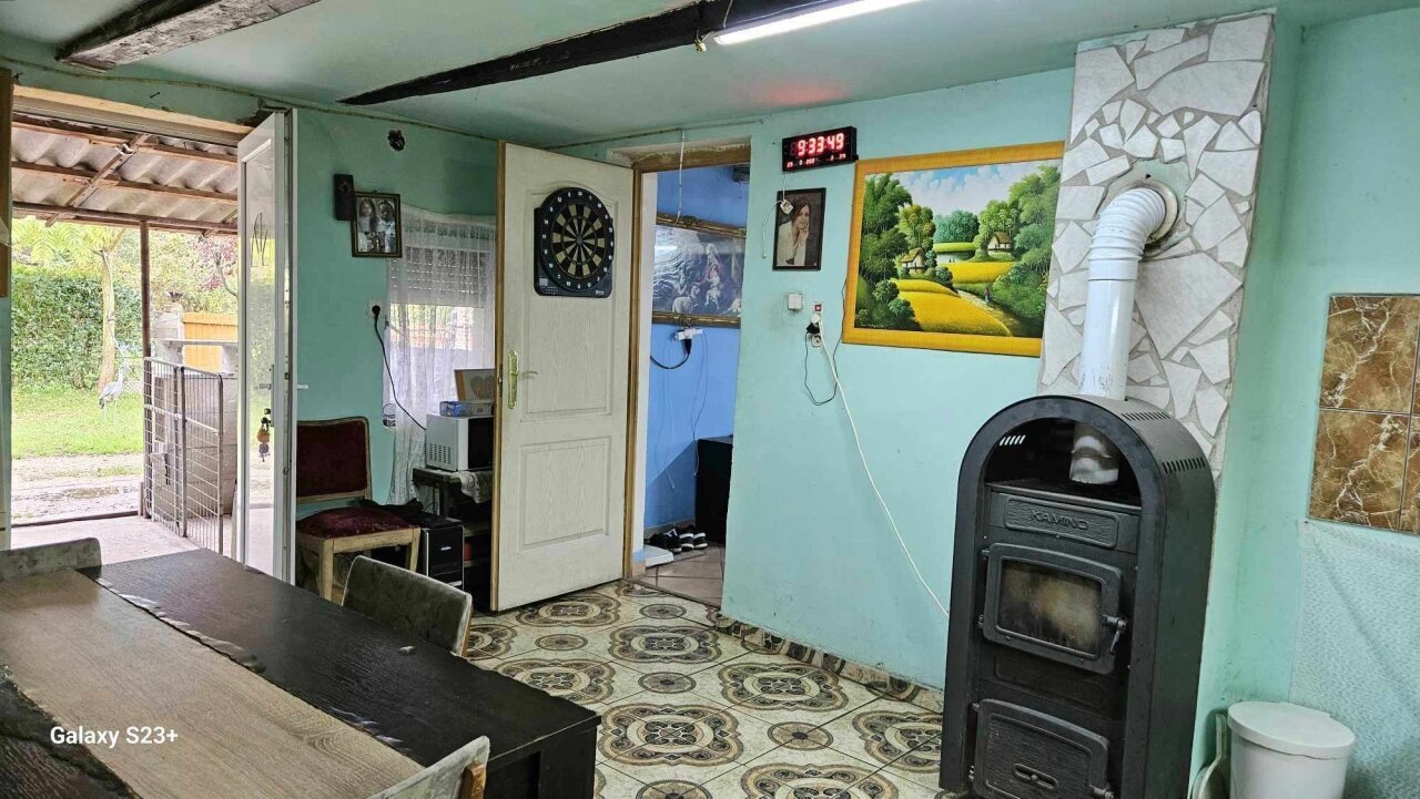 Räume: überdachte Terrasse, Wohnzimmer, 2 Schlafzimmer, Küche, Badezimmer. Nebengebäude mit Holzlager und Garage. Elektrizität, Wasser, Kanalisation mit Abfluss. Heizung mit Holzofen. Der größte Teil des Grundstücks ist bewaldet.