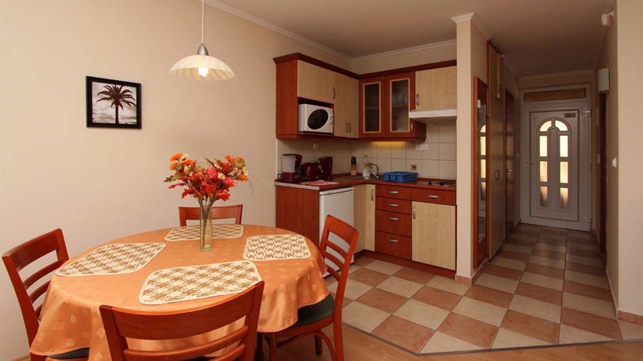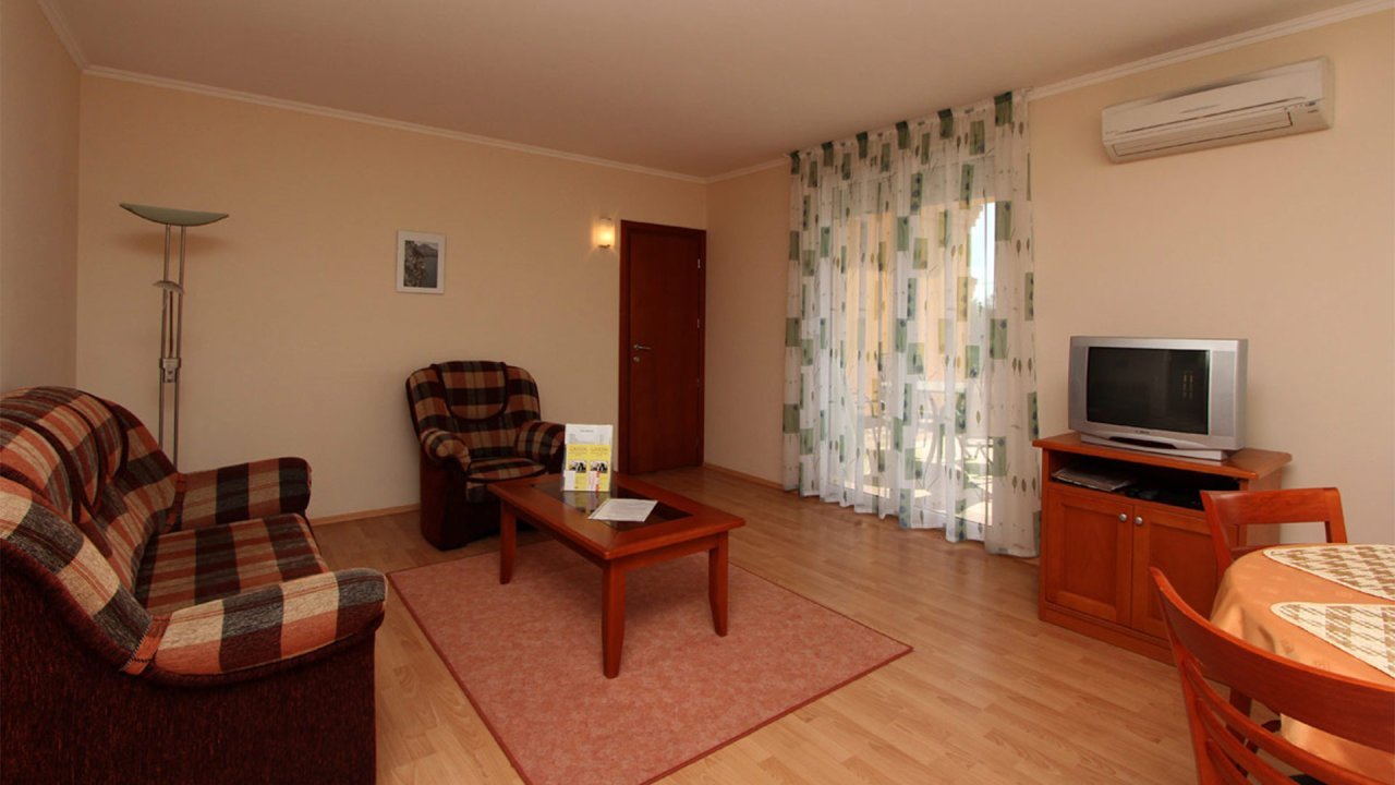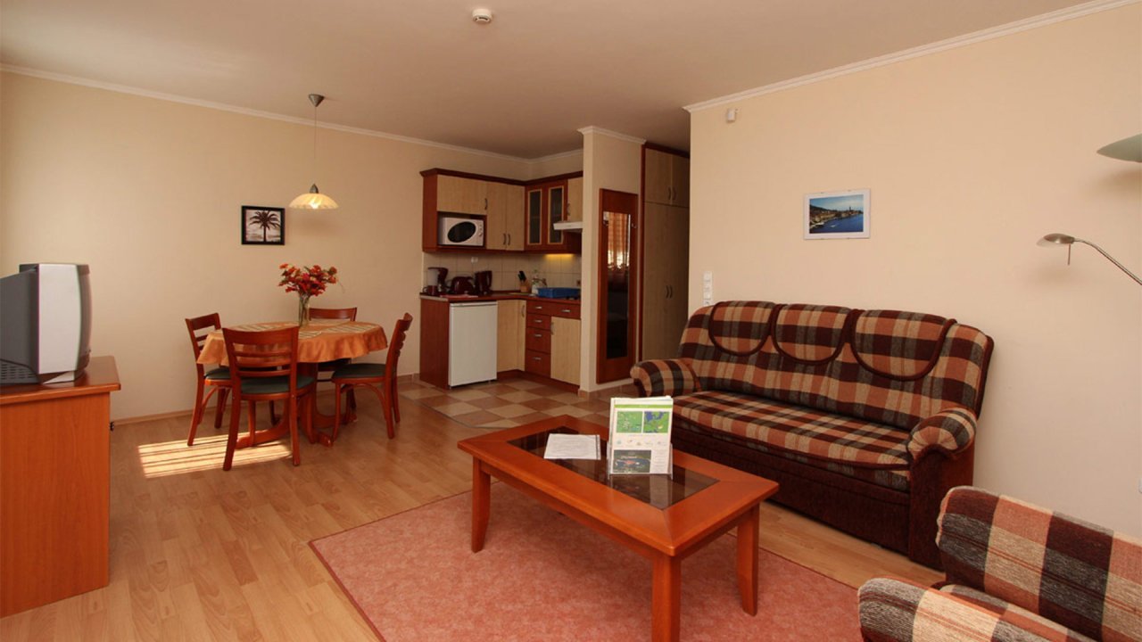 Das 2005 erbaute Gebäude besteht aus acht 2+2-Bett-Apartments mit einer Fläche von je 40 m² (mit separatem Schlafzimmer). Jedes Apartment ist klimatisiert und mit einer Küche, einem Badezimmer mit Dusche, einem Kühlschrank, einem Smart-TV und einem Balkon oder einer Terrasse ausgestattet.