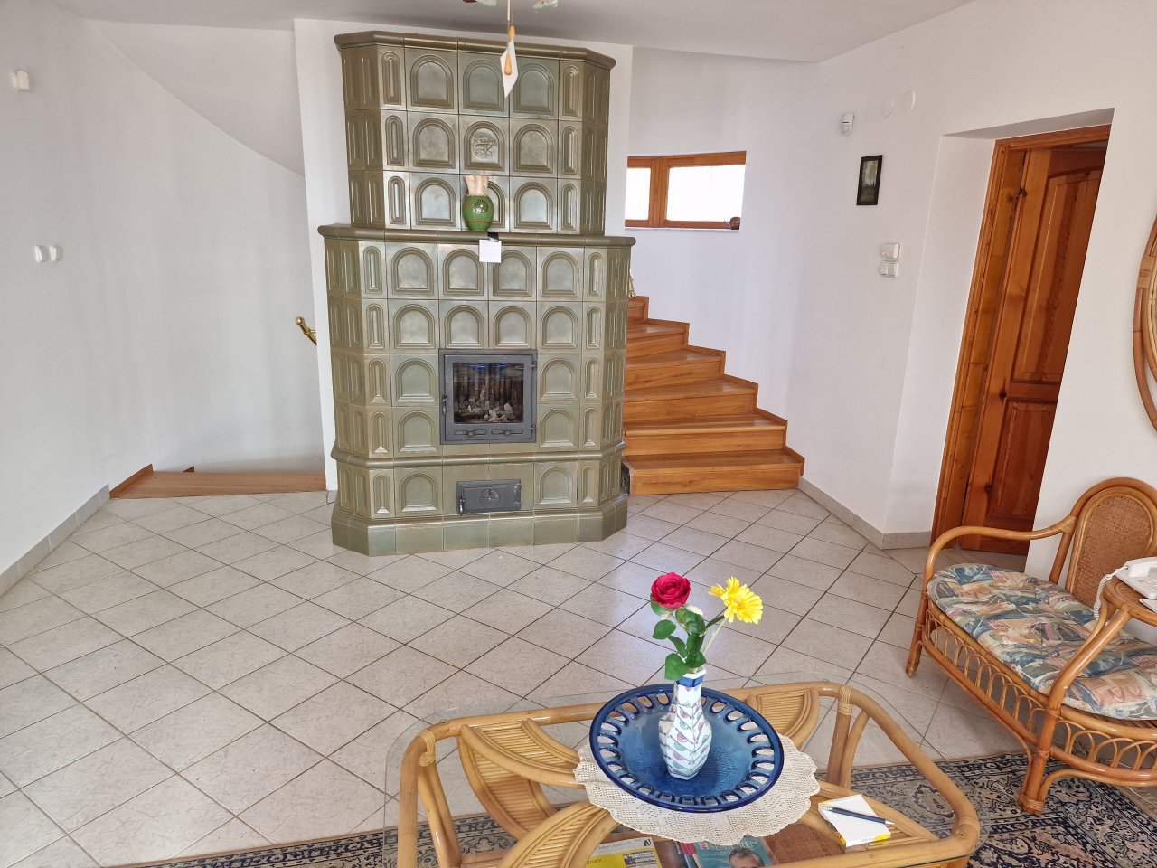 - vom Esszimmer gelangt man entweder in den Wintergarten, oder aber direkt in den Wohnbereich mit dem großen Kachelofen, der in seiner dezenten taubenblauen Farbe dem gesamten Erdgeschoss diesen noblen Charme eines echten Herrenhauses verleiht.