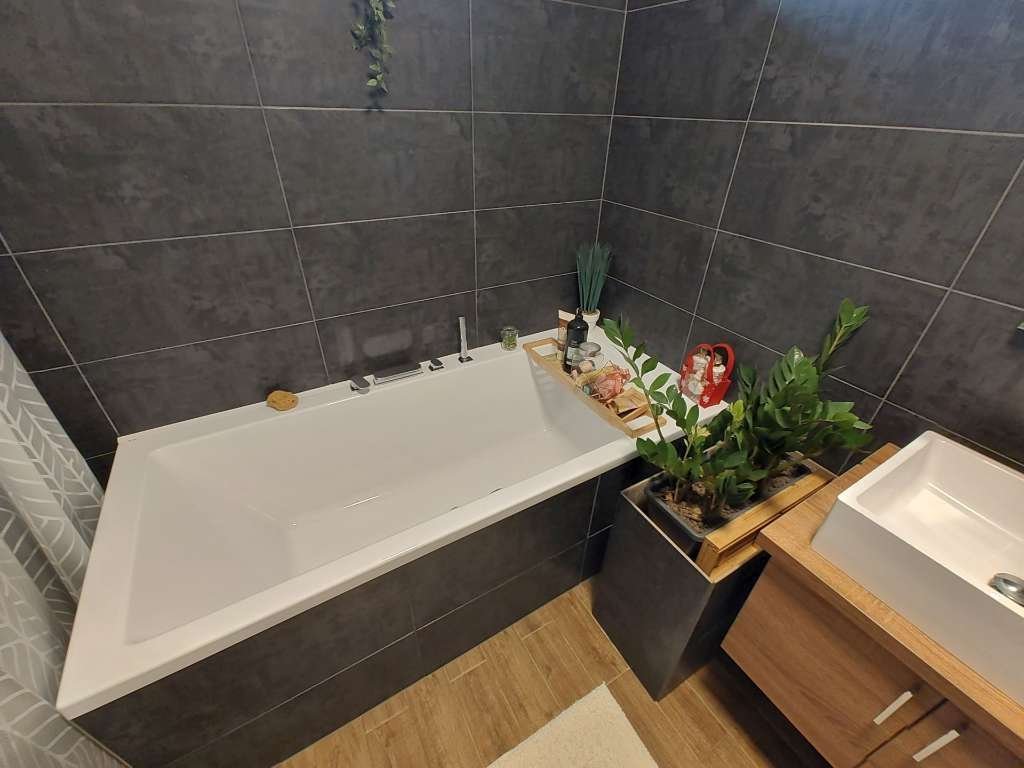 Das Hauptschlafzimmer bietet einen praktischen, separaten Garderobenraum. Das Bad bietet eine breite, barrierefreie Dusche und eine bequeme Wanne sowie ein Waschtisch. Die Toilette ist in einem extra Raum untergebracht. Dazu kommt ein Hauswirtschaftsraum und ein kleines Gäste-/Kinderzimmer oder Homeoffice.