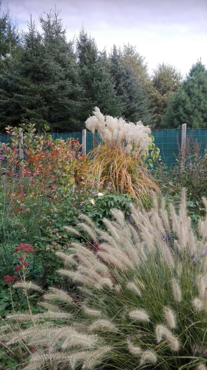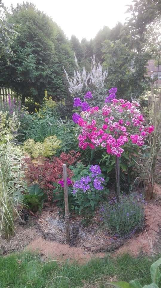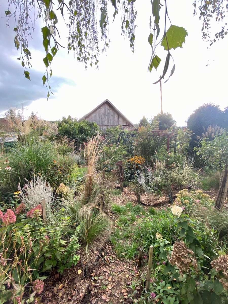 Vor dem Haus befinden sich sorgfältig gestaltete Blumen, Ziergräser und Rosen, während sich hinter dem Haus ein blühender Garten zwischen Obstbäumen und -sträuchern erstreckt. Das Grundstück ist eingezäunt, was die Privatsphäre gewährleistet.