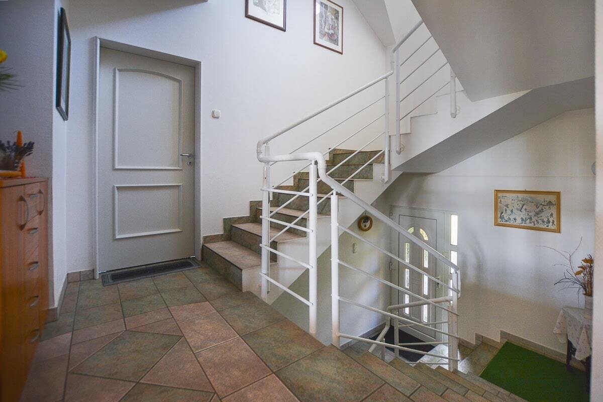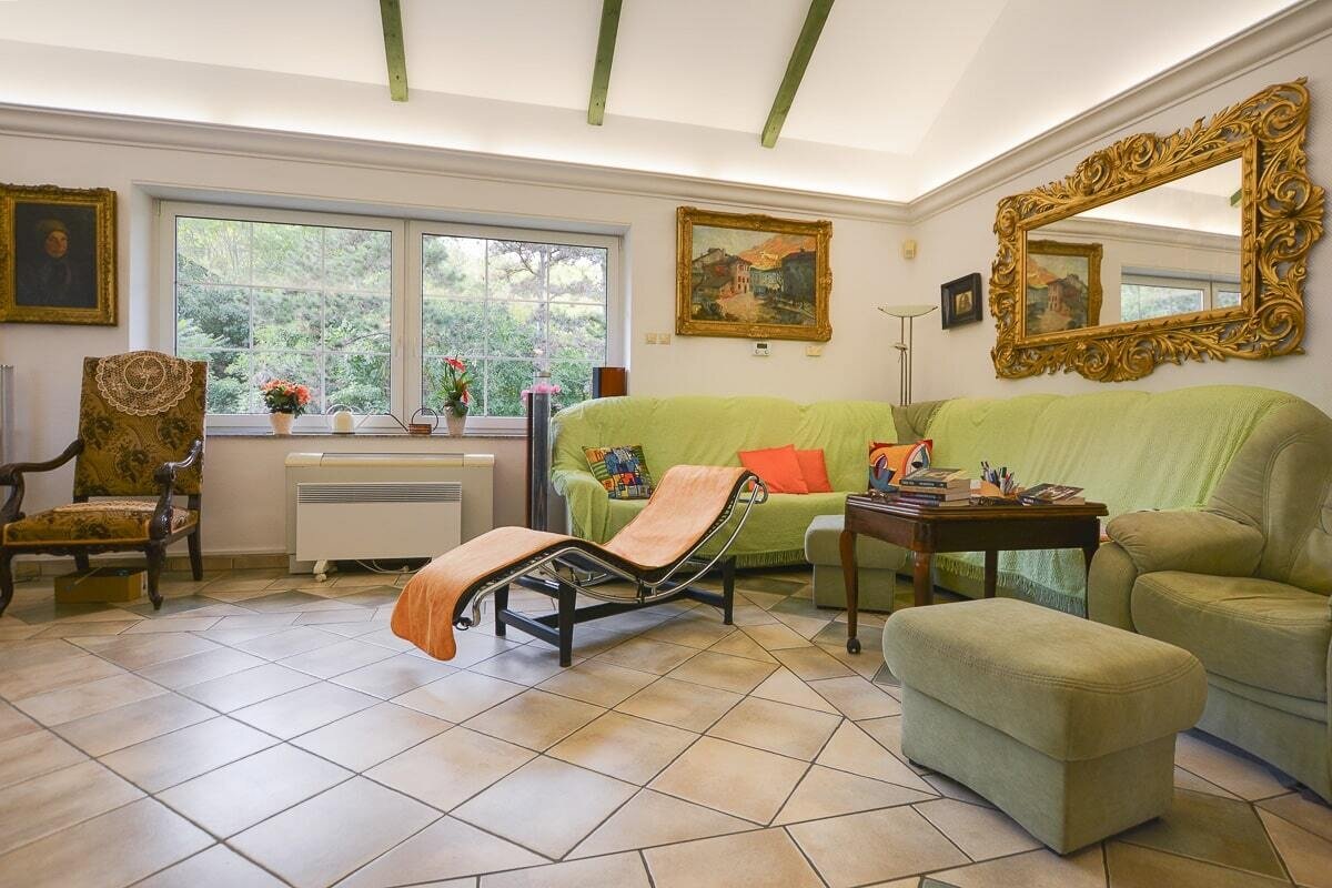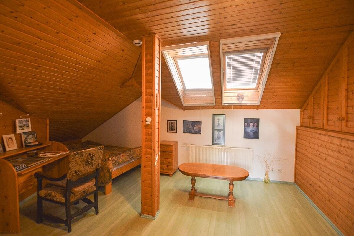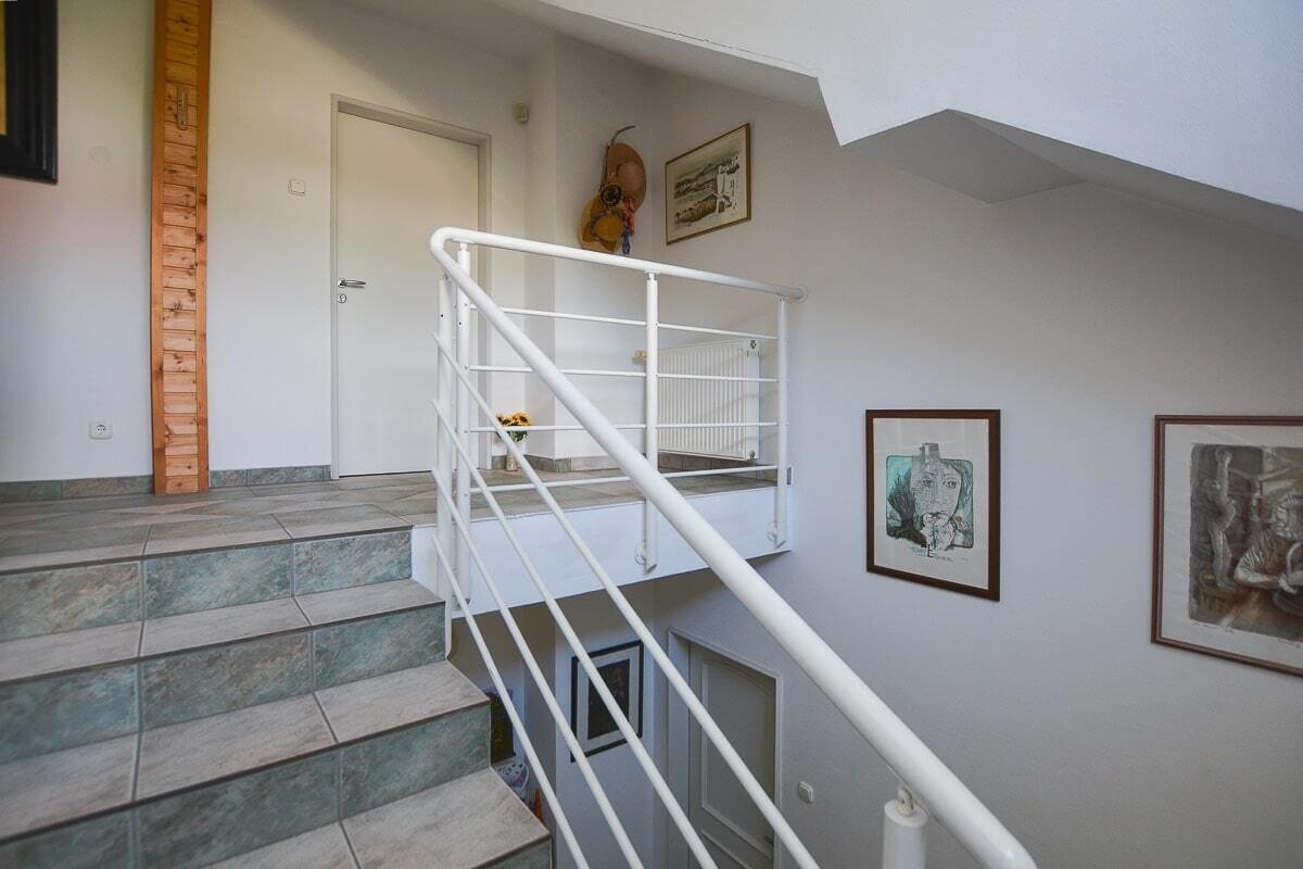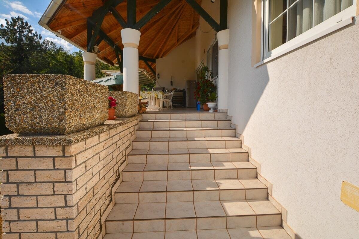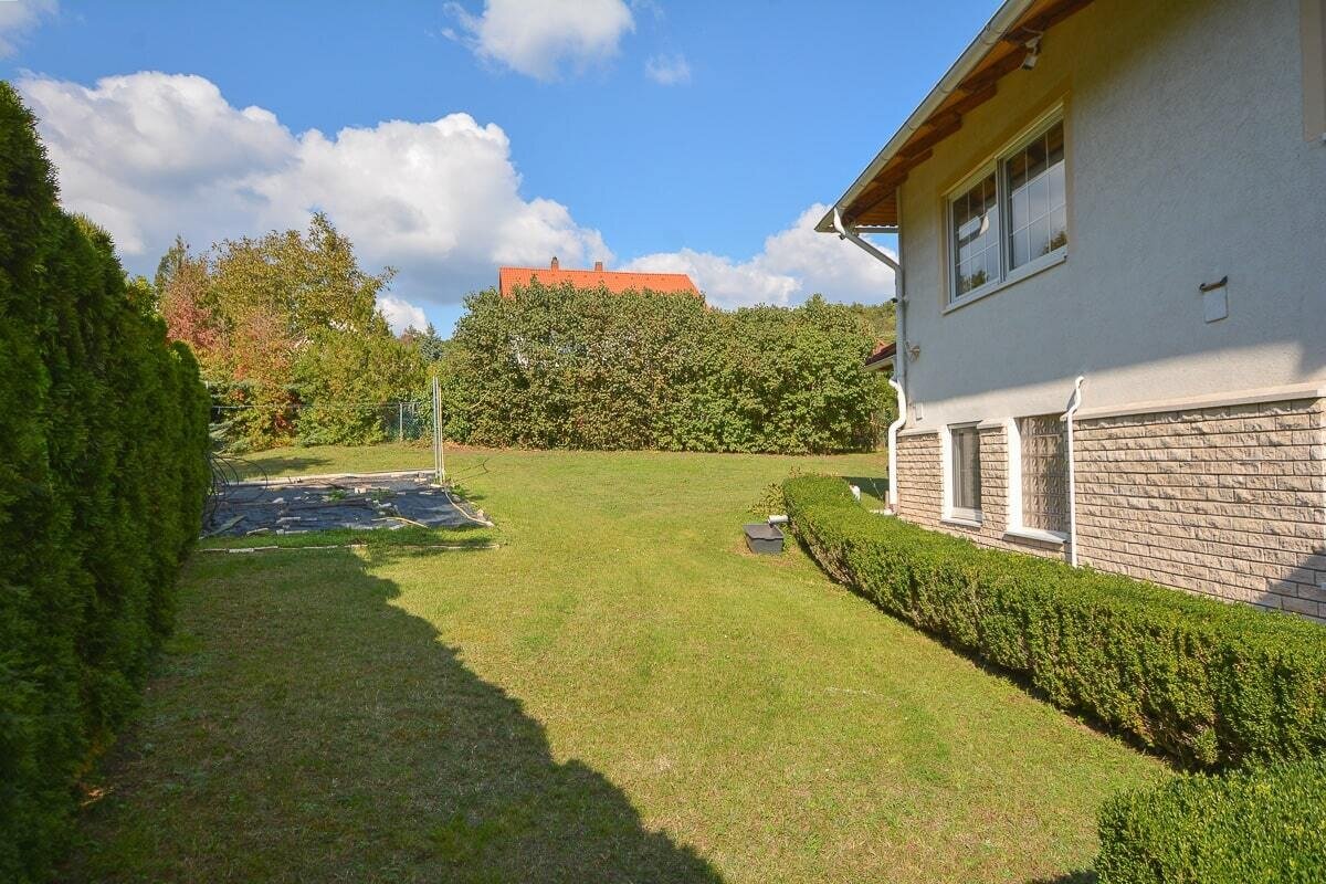 Waldnah, in wunderschöner Natur gelegene Villa in Vonyarcvashegy ist zu verkaufen. Das Haus wurde im Jahre 1998 mit ausgezeichneten Qulaitätsbaumaterialien errichtet. Das Haus kommt mit 4 Ebenenen, im Kellergeschoß wurden ein Gesellschaftsraum für Freundestreffen, und Räumlichkeiten für Nutzung als Weinkeller eingerichtet. Das Erdgeschoß kommt mit einer Einliegerwohnung, einem Wellness-Raum und einer Doppelgarage. Das Wellness-Raum ist mit Sauna + Jacuzzi ausgestattet. Das erste Geschoß ist durch weitläufige Räumlichkeiten geprägt, hier befindet sich das schöne, großzügige Wohnzimmer mit der offnenen Küche. Von der Küche eröffnet sich eine überdachte, südlich ausgerichtete Terrasse. Im Dachgeschoß wurden mehrere Zimmer und Badezimmer geeignet für Gäste eingerichtet. Das Haus wird mit Gaszentralheizung erwärmt, darüber hinaus stehen Fancoil-Heizungssystem und ein Kachelofen zur Verfügung. Zur Unterstützung des Strombedarfs wurde ein 8 kW Solarmodul installiert. Für die Sicherheit des Hauses sorgt ein Alarmsystem mit Kameras.