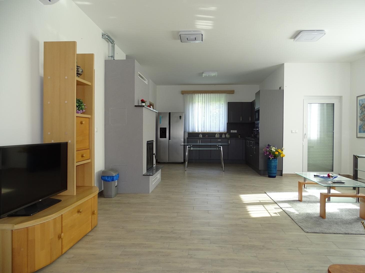 Holzofen im Wohnzimmer – drei Klimageräte ( warm/kalt ) - Fliesen – Laminat –