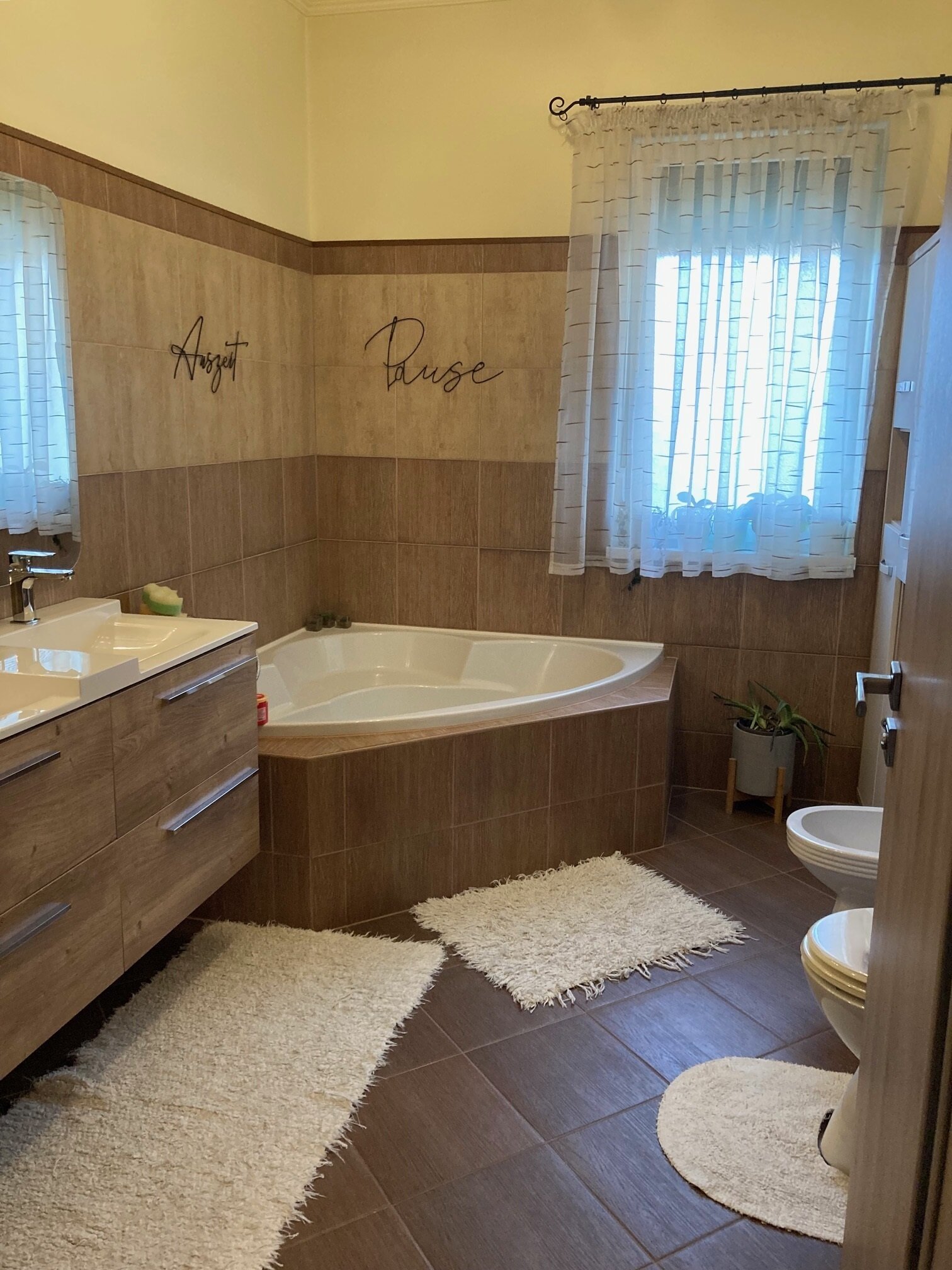Im Jahr 2023 wurde die Immobilie umfassend modernisiert: neue Fenster mit elektrischen Rollläden und Insektenschutz, erneuerte Bodenbeläge, Solaranlage, neuer Bosch-Gas-Brennwertkessel, kombinierte Fußboden- und Radiatorheizung sowie ein gemütlicher Kamin im Wohnbereich. Die moderne Einbauküche mit Kochinsel erfüllt höchste Ansprüche, während die Klimaanlage ganzjährig für optimalen Komfort sorgt.