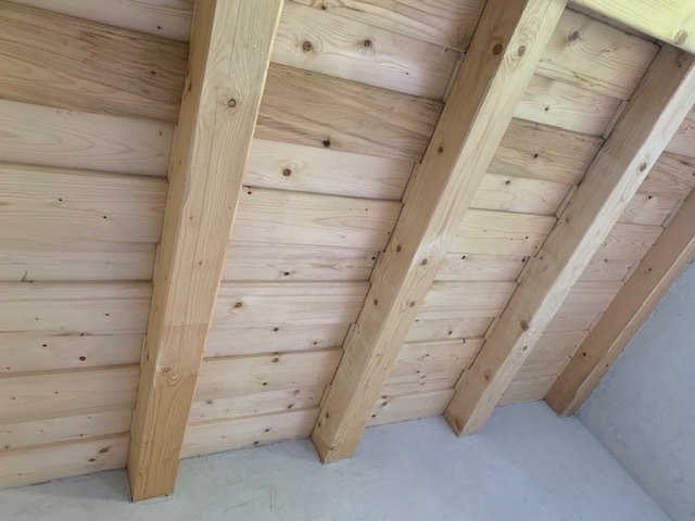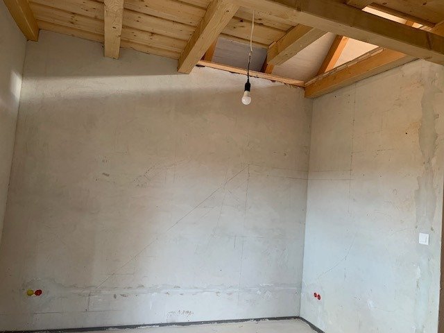 Die Grundfläche des Hauses selbst beträgt 40 Quadratmeter. Mit zwei Etagen und einer Terrasse bietet es knapp 100 Quadratmeter Wohnfläche. Die Balken der Dachterrasse sind bereits angebracht. Damit das Haus vollständig bewohnbar ist, sind noch Verputz-, Fliesen- und Malerarbeiten erforderlich.
