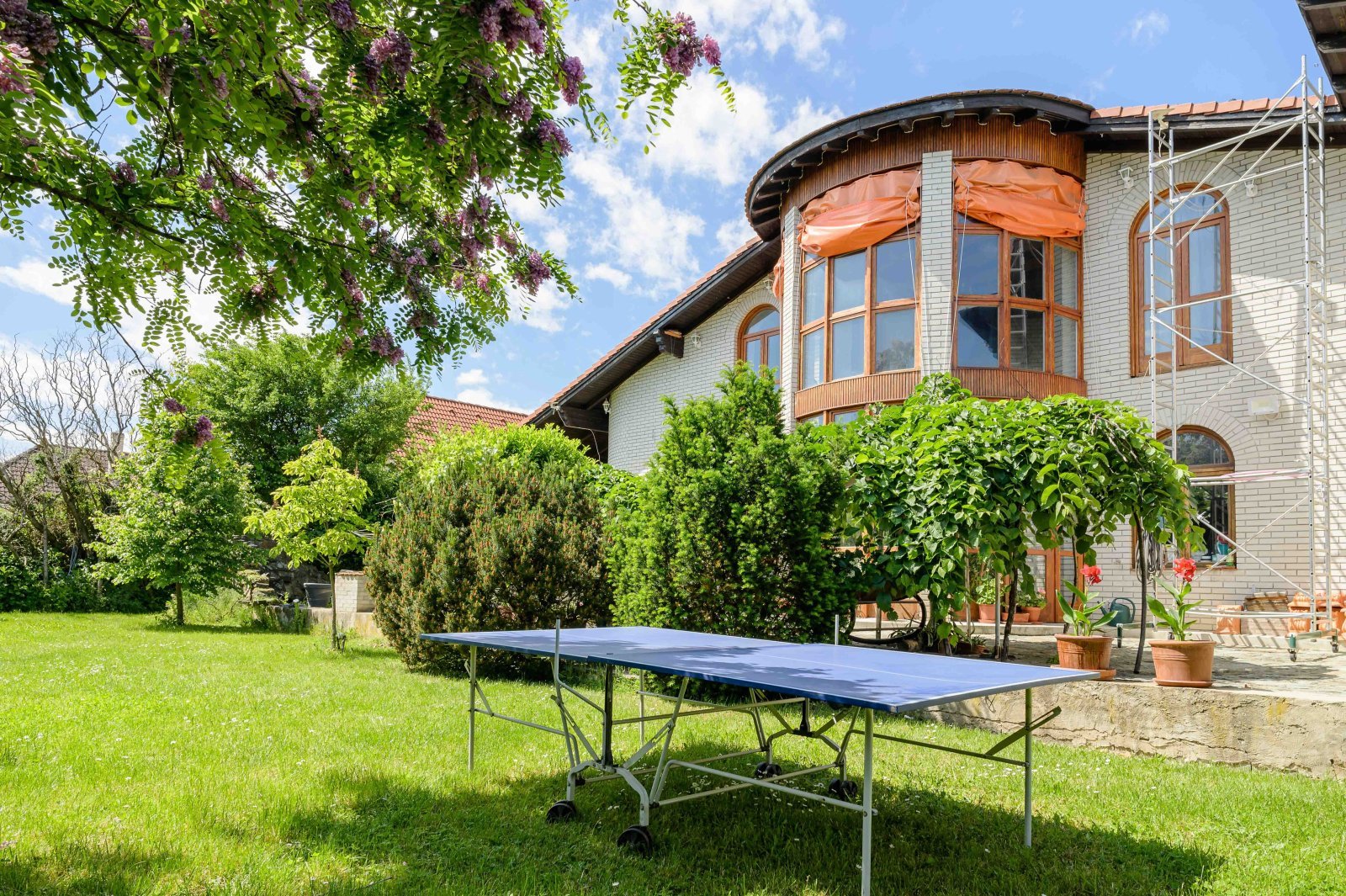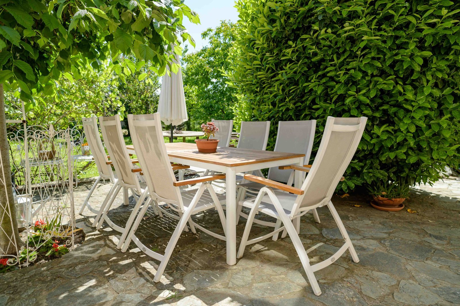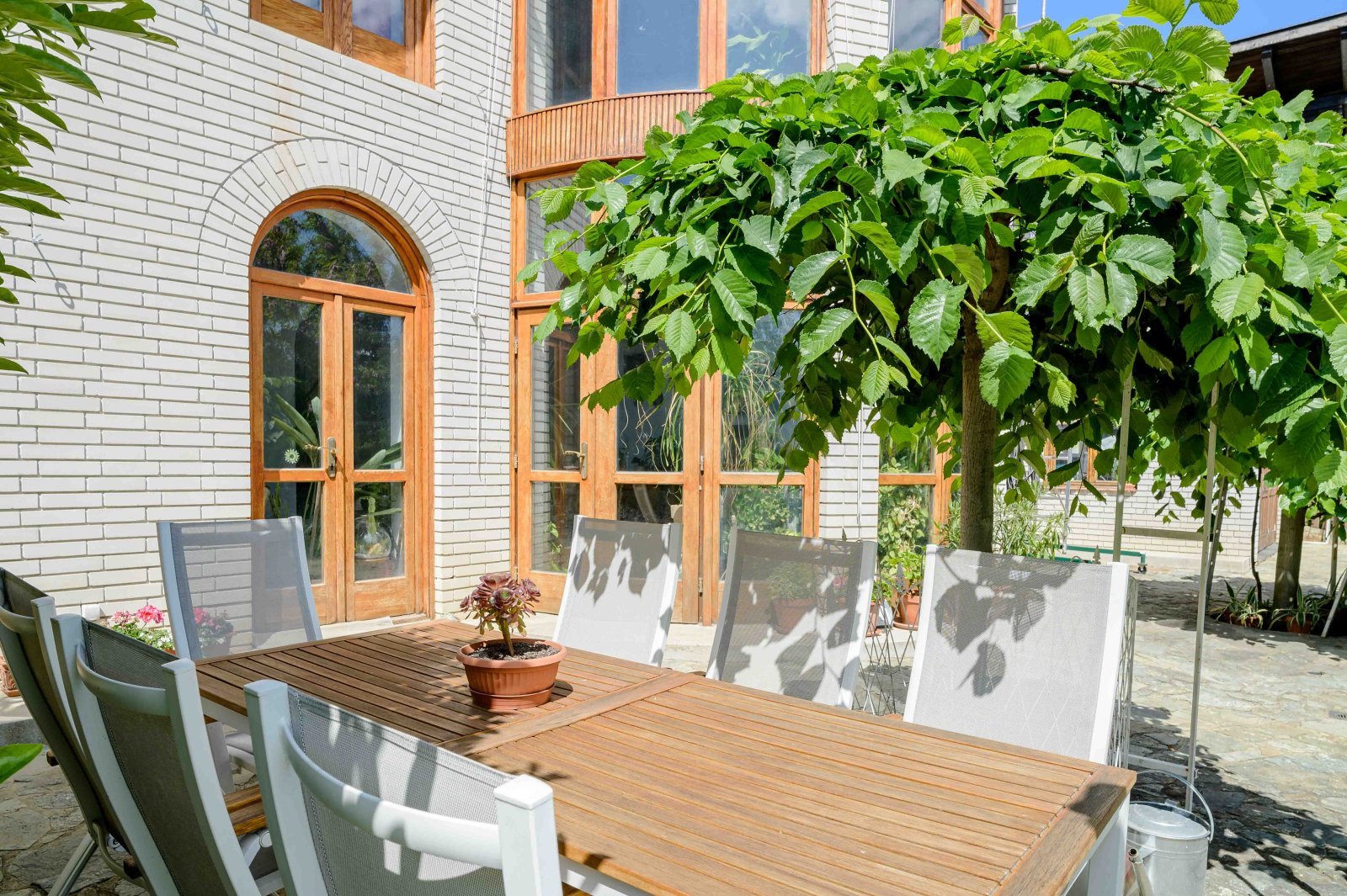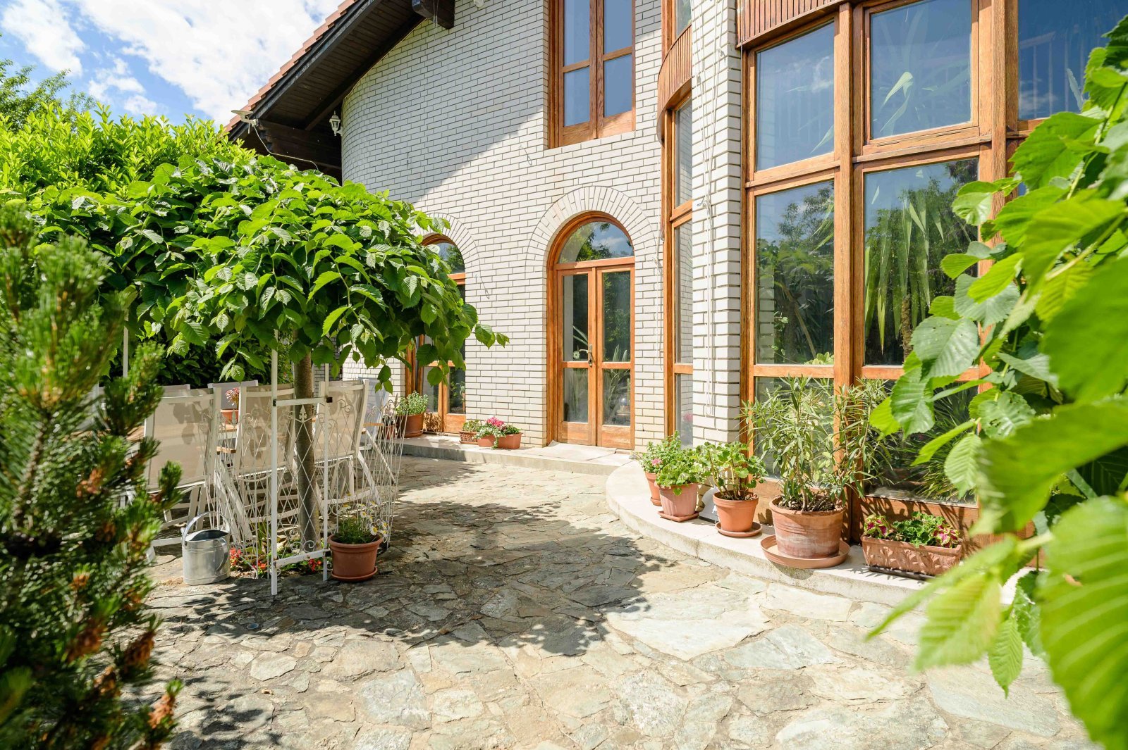 - Hofteil: 80 m² Terrasse mit Csatár-Stein gepflastert + 20 m² überdachte Terrasse
