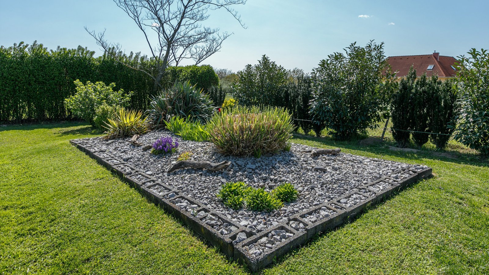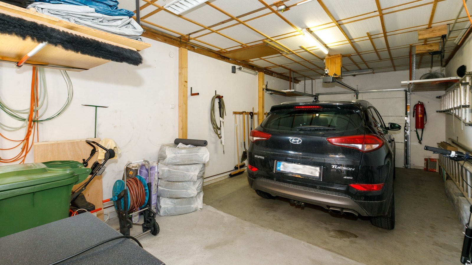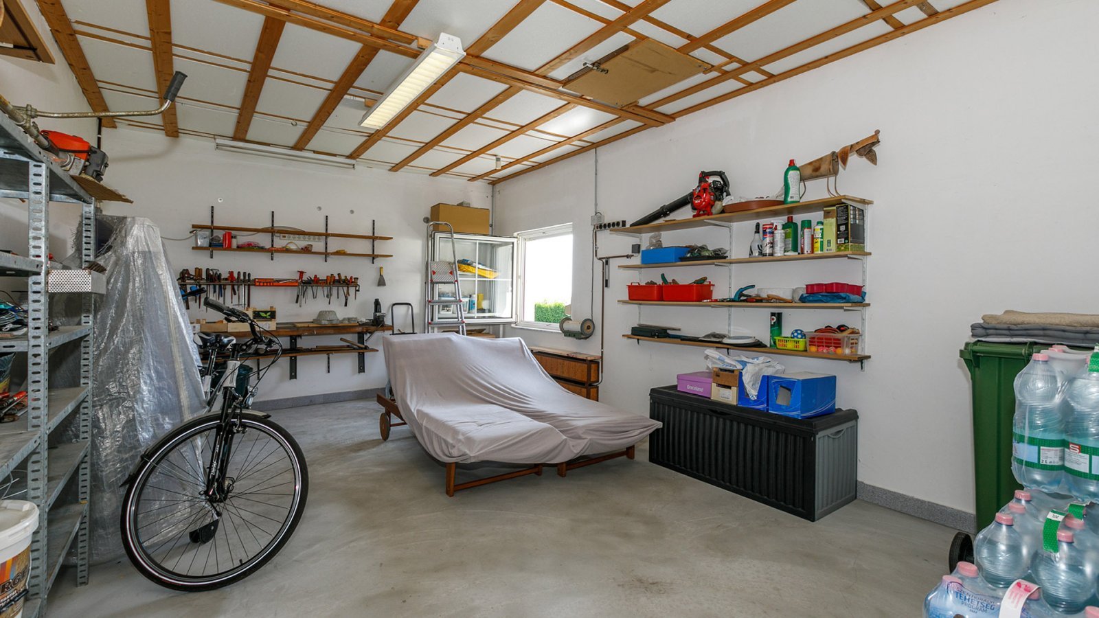 Das Haus verfügt über eine große beheizte Einzelgarage und einen Abstellraum neben dem Terrassenbereich.