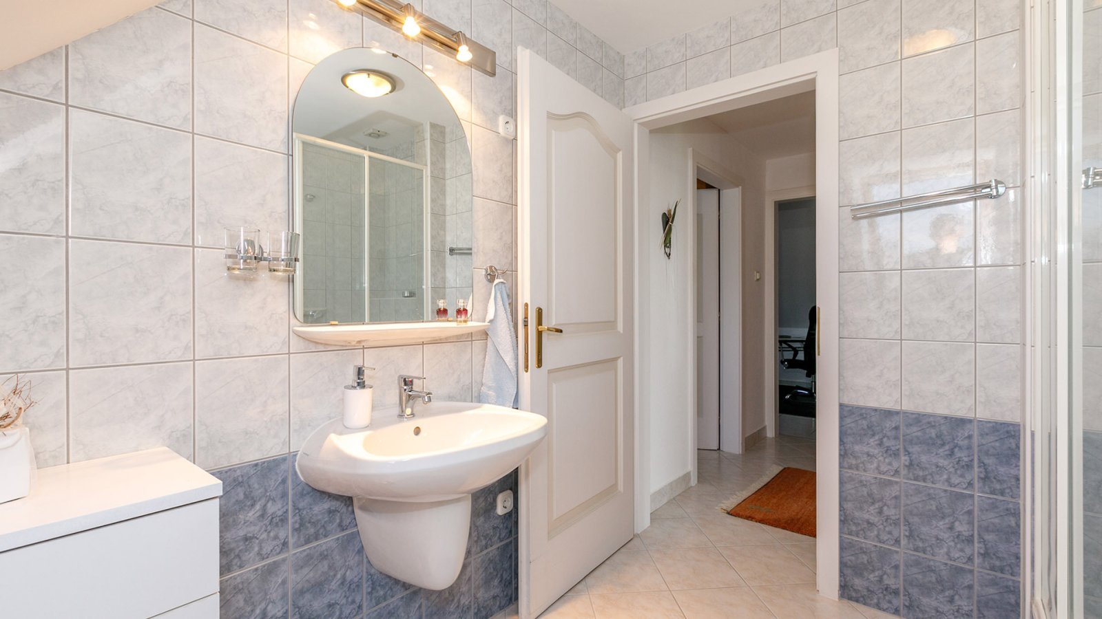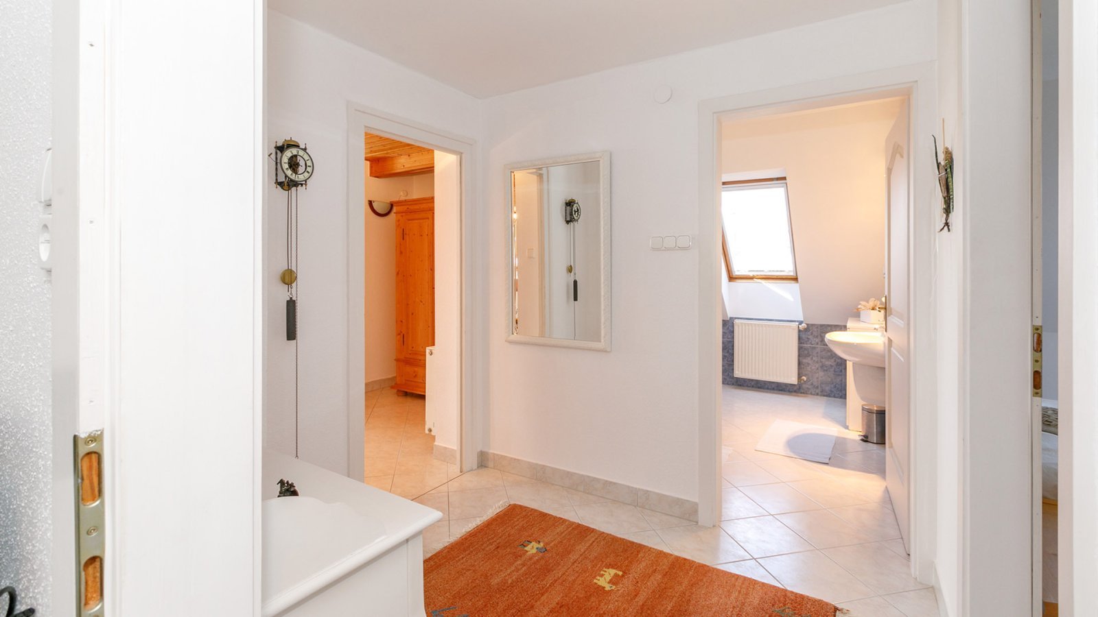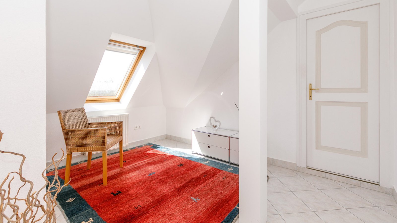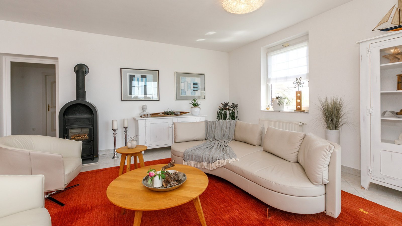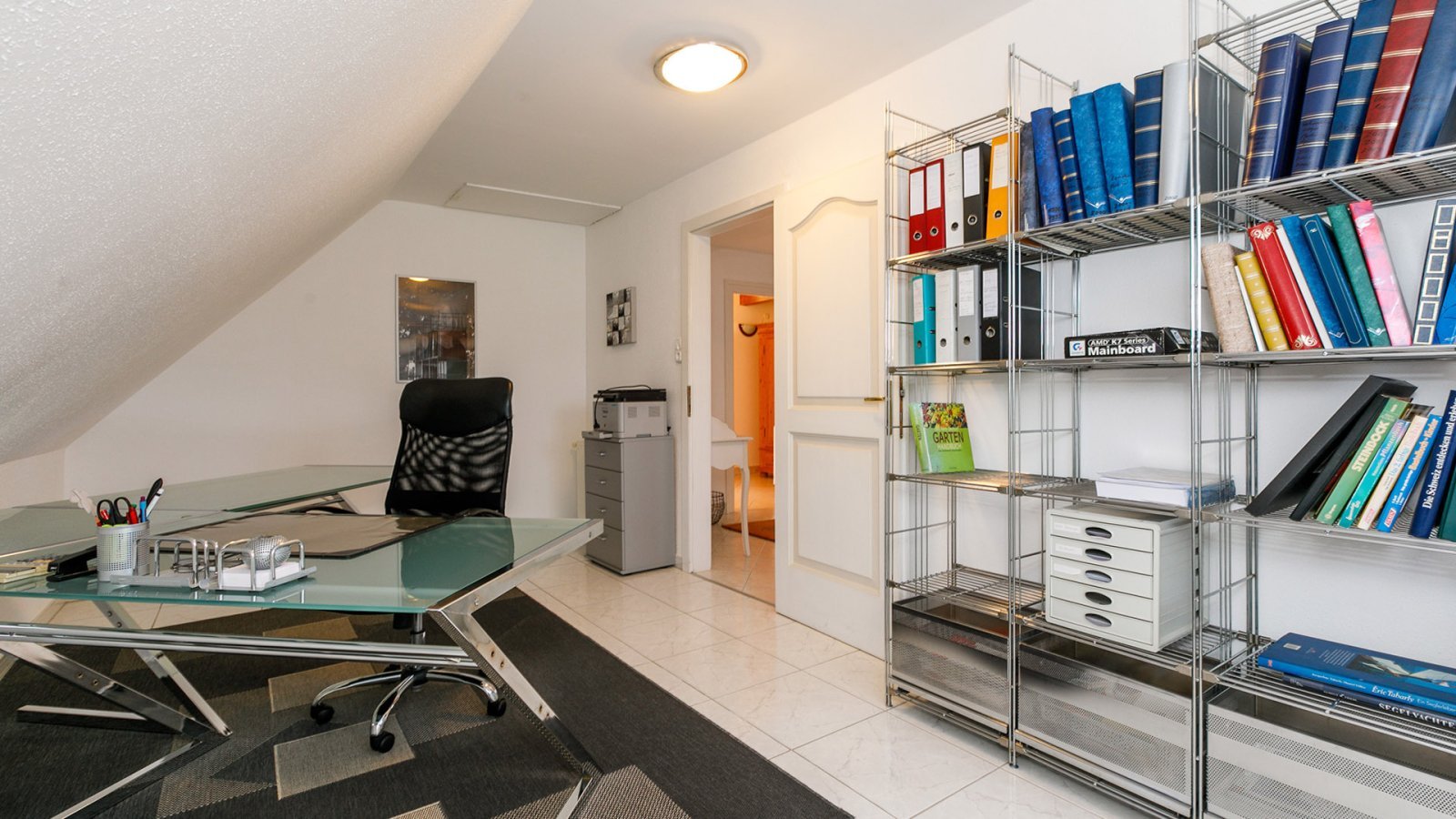 Im Erdgeschoss befinden sich ein geräumiges Wohnzimmer, zwei Schlafzimmer, ein Badezimmer und eine Küche mit angrenzendem Hauswirtschaftsraum sowie eine Gästetoilette. Im ersten Stock befindet sich ein Spiegelbild des Erdgeschosses. Hier gibt es ein großes Wohnzimmer, zwei Schlafzimmer, ein Badezimmer, ein kleines Büro und einen ausgebauten Dachboden.