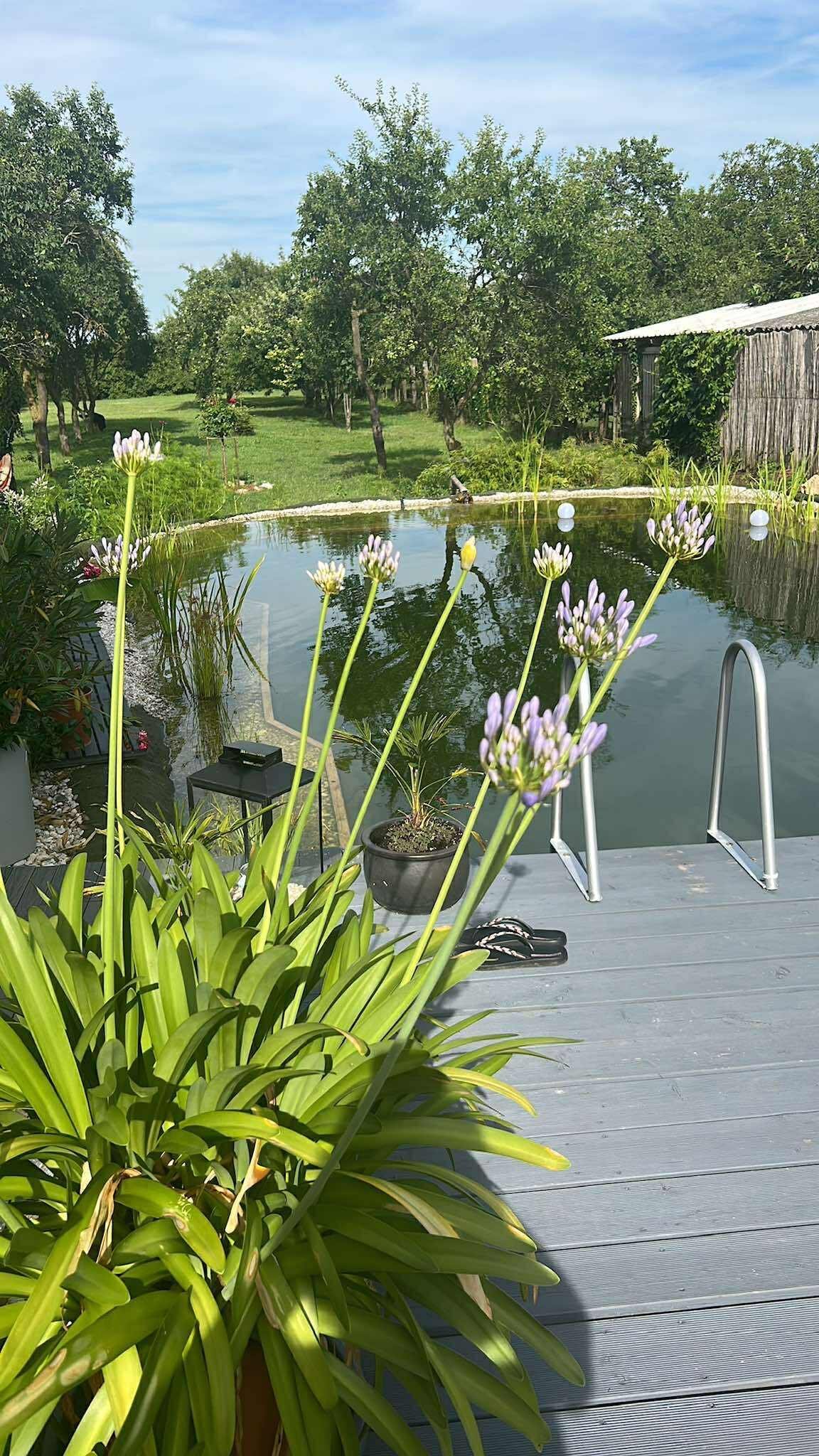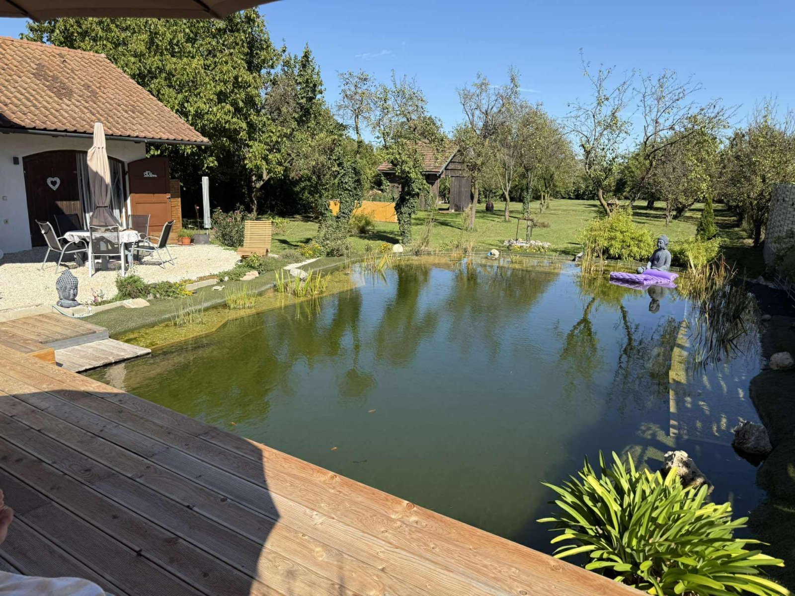 - Umzäuntes, nicht einsehbares Grundstück mit wunderschön angelegtem Garten, Obstbäumen und großem Naturpool (12 x 6 m, klar, mit Biofilter)