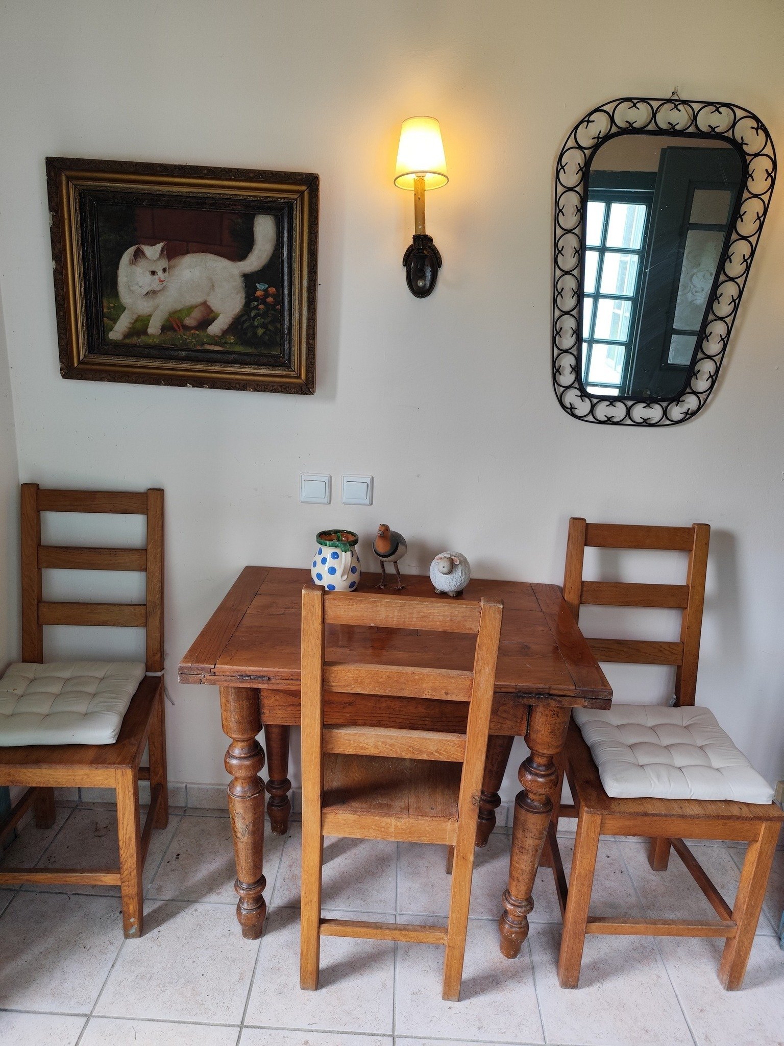 Vom Vorraum gelangt man in einen geräumigen Flur, wo sich der wahre Charme des Hauses weiter entfaltet. Im Innenbereich befinden sich zwei Zimmer, ein Esszimmer, eine Küche und ein Badezimmer.