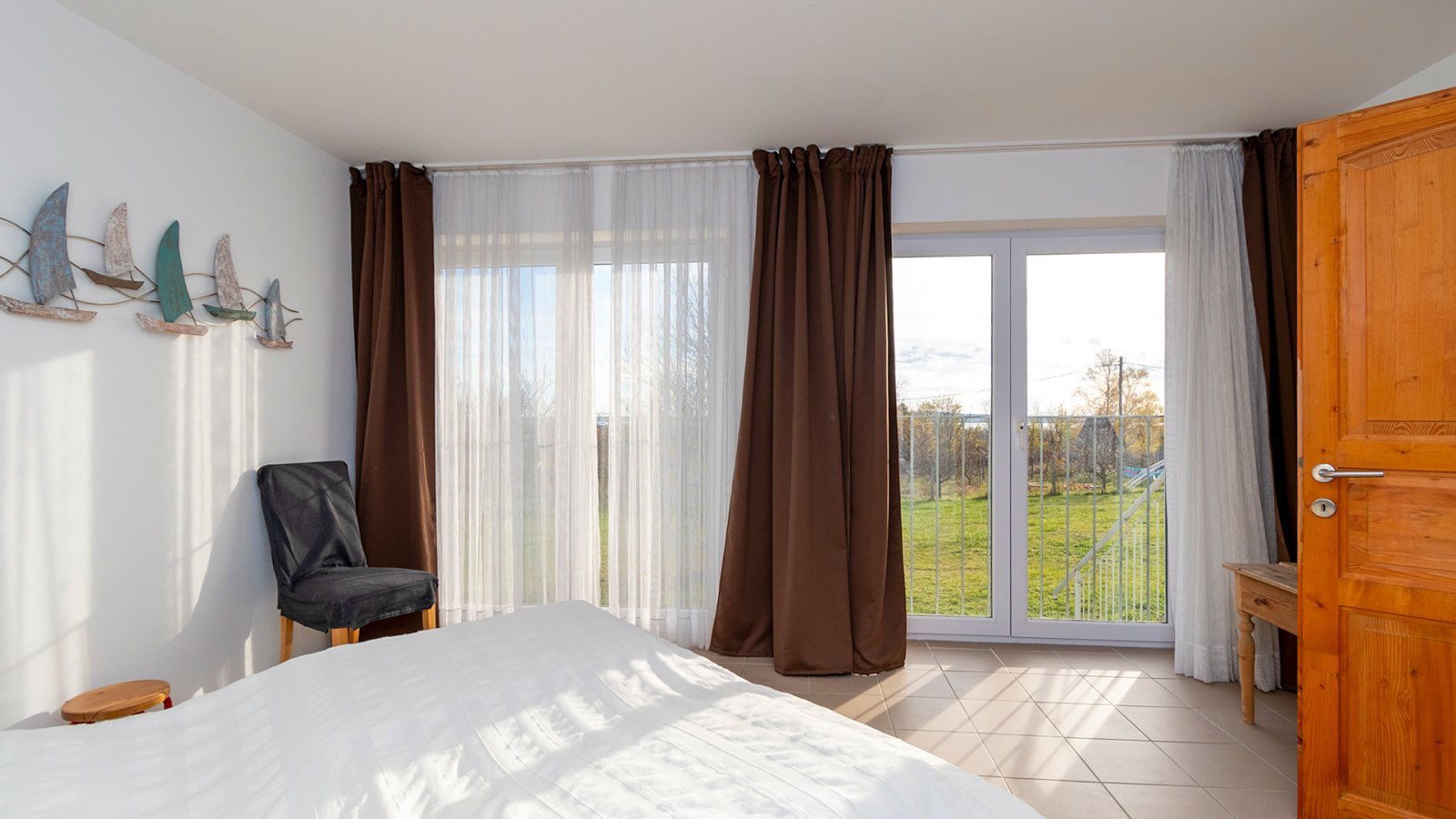 - Erster Stock: 2 Schlafzimmer mit raumhohen Fenstern; Badezimmer mit Dusche.