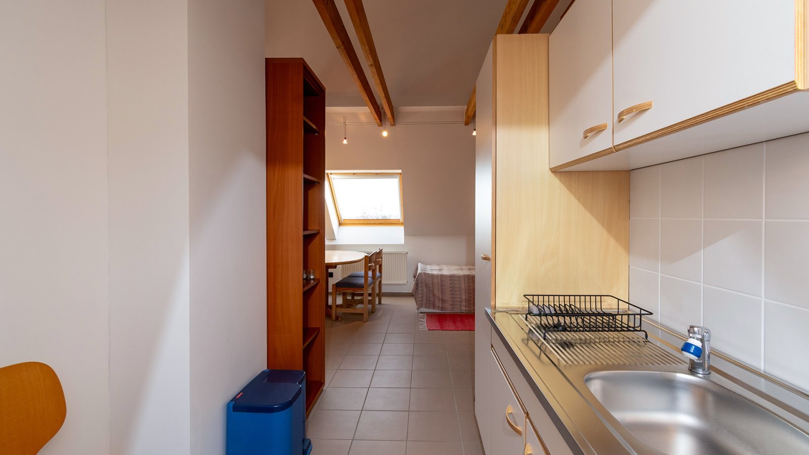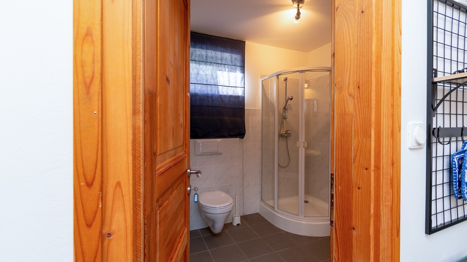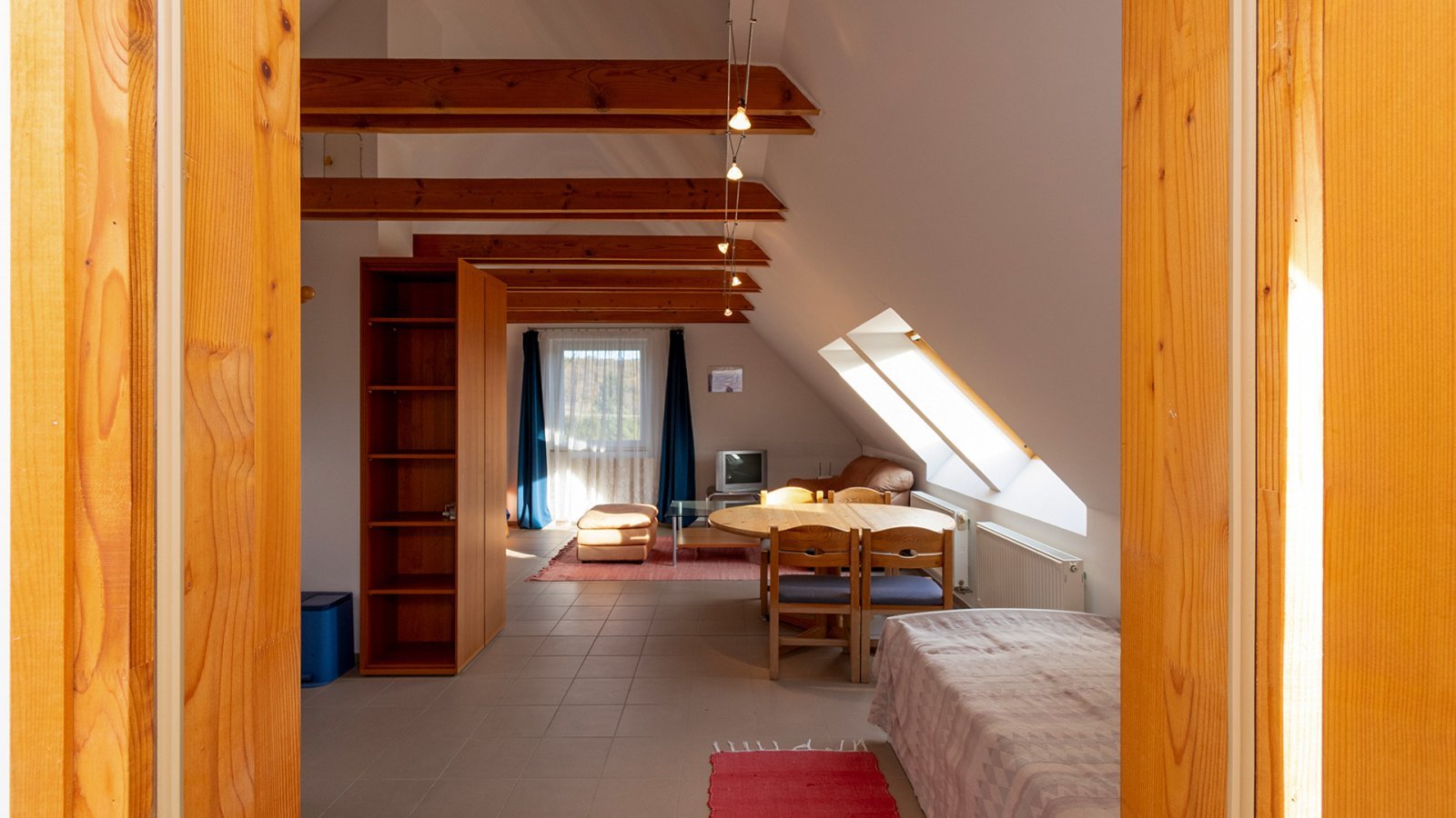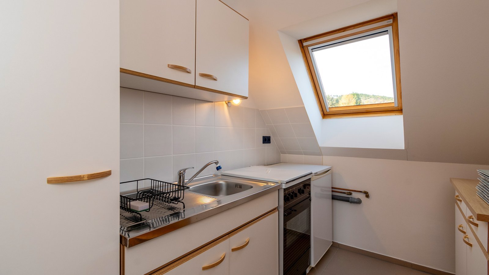 - Dachgeschoss: helles Wohn-Schlafzimmer mit Kochnische und Badezimmer mit Dusche.