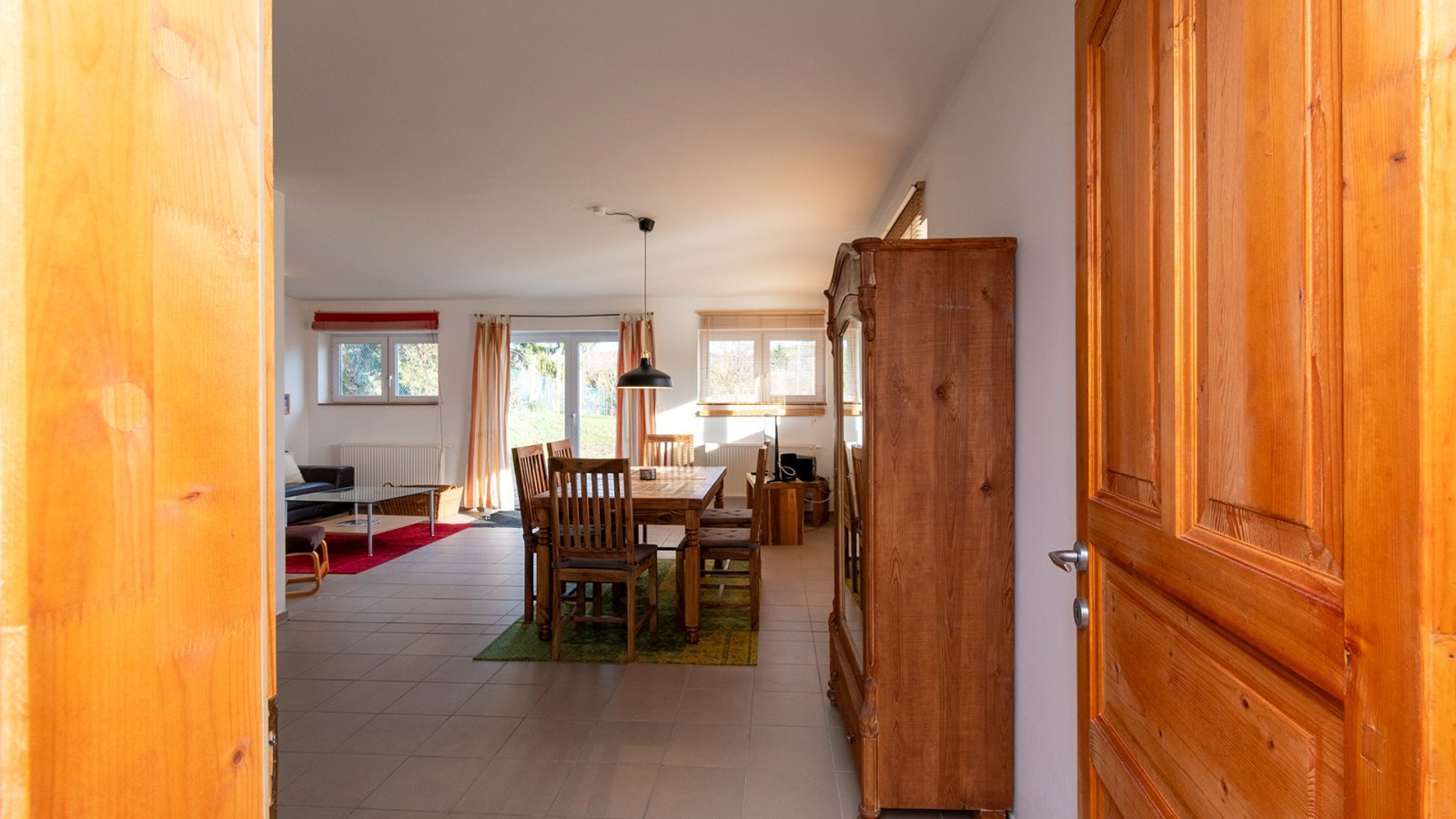 - Erdgeschoss: großes Wohn-Esszimmer mit integrierter, geräumiger Küche, direkter Anschluss zum Garten; Badezimmer mit Dusche; Hauswirtschaftsraum mit Waschmaschine und Gaszentralheizungskessel.