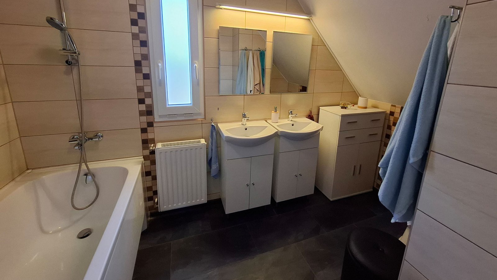 Im Untergeschoss befinden sich ein Wohnzimmer, ein Zimmer mit separatem Eingang und ein großer Hauswirtschafts-/Abstellraum, der sich mit geringem Aufwand in einen separaten Wohnbereich umwandeln lässt. Dadurch eignet sich das Haus hervorragend für zwei Generationen zum Zusammenleben oder zur Vermietung. Im Erdgeschoss bilden Wohn-, Ess- und Küchenbereich einen hellen und offenen Raum mit Zugang zur Terrasse und herrlichem Ausblick. Auf dieser Ebene befinden sich außerdem ein weiteres Zimmer, ein Badezimmer und ein separates WC. Im Dachgeschoss befinden sich drei Zimmer, ein Badezimmer, ein separates WC und ein kleiner Balkon mit einem wunderschönen Panoramablick auf den Wald von Csatár.