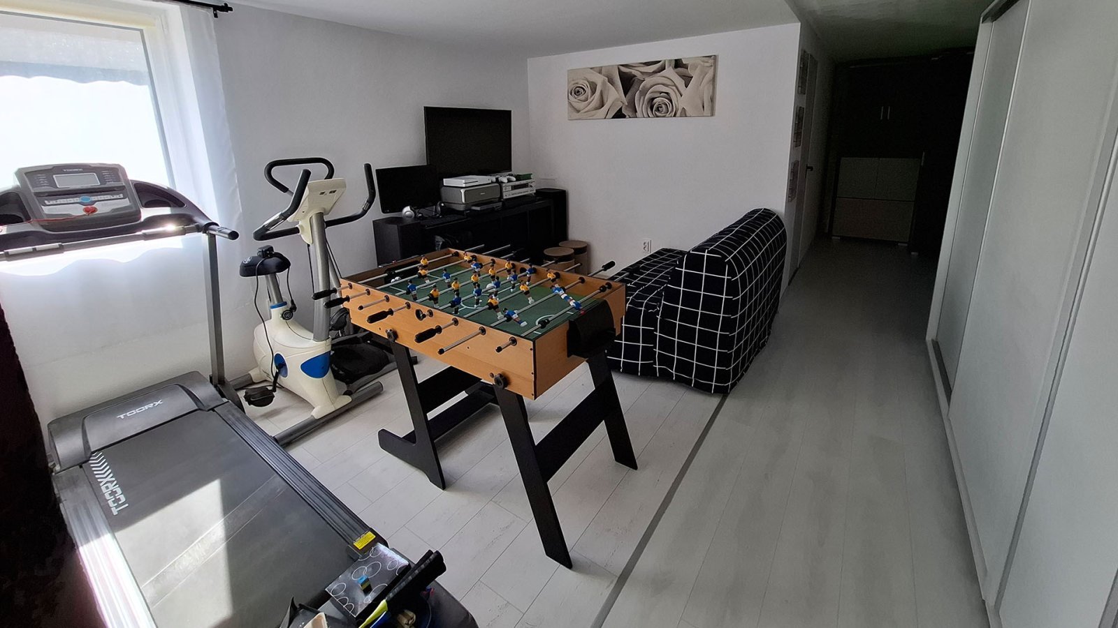 Das Untergeschoss ist gemauert, Erdgeschoss und Dachgeschoss sind in Leichtbauweise errichtet. Das Haus verfügt über ein Wohnzimmer, vier separate Zimmer, zwei Badezimmer, zwei separate WCs, einen Hauswirtschaftsraum, einen Balkon und zwei Terrassen, darunter eine fast 50 m² große überdachte Terrasse, die sich hervorragend für Treffen mit Familie und Freunden eignet. Beheizt