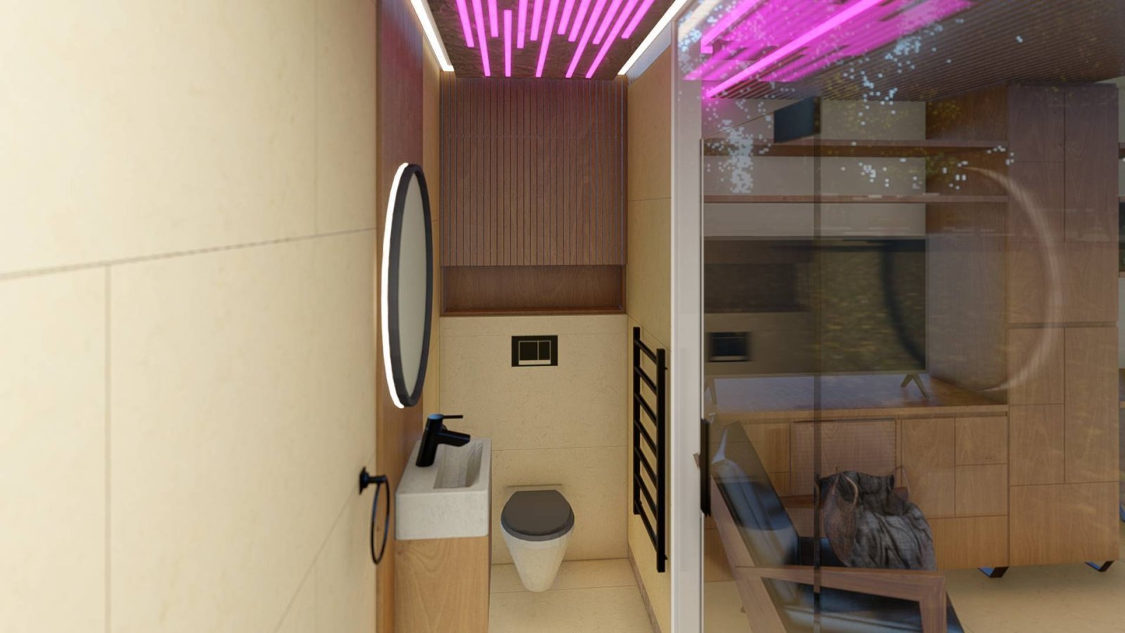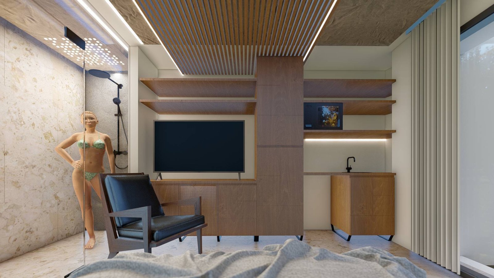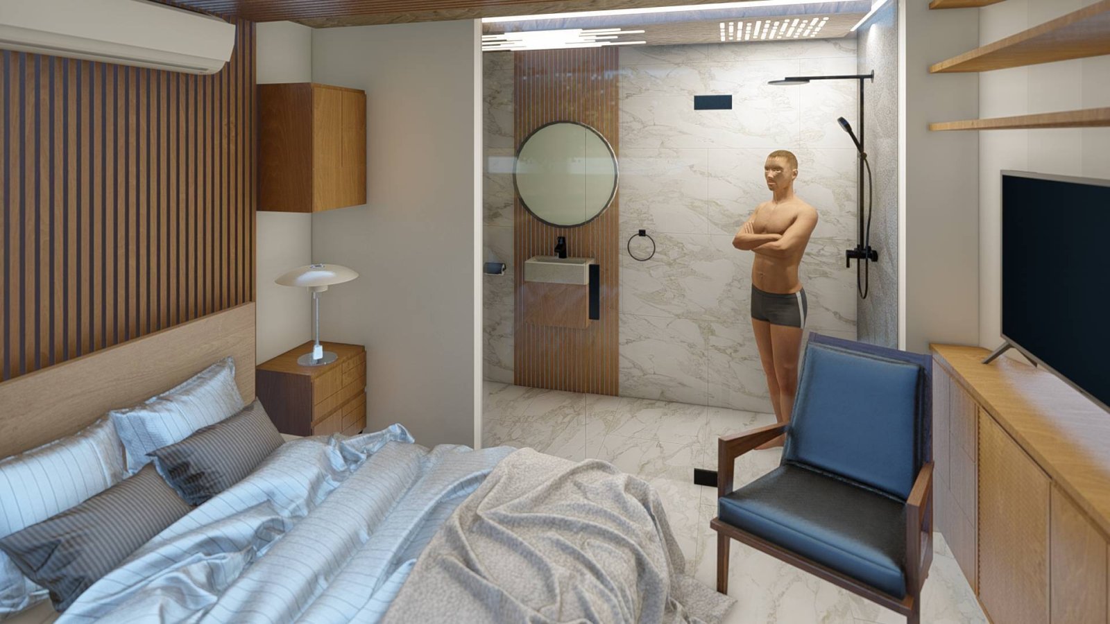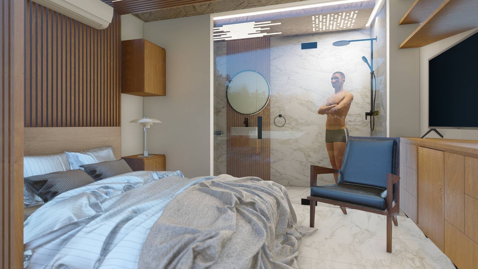 - Das Badezimmer ist mit einer einzigartigen Regendusche ausgestattet.