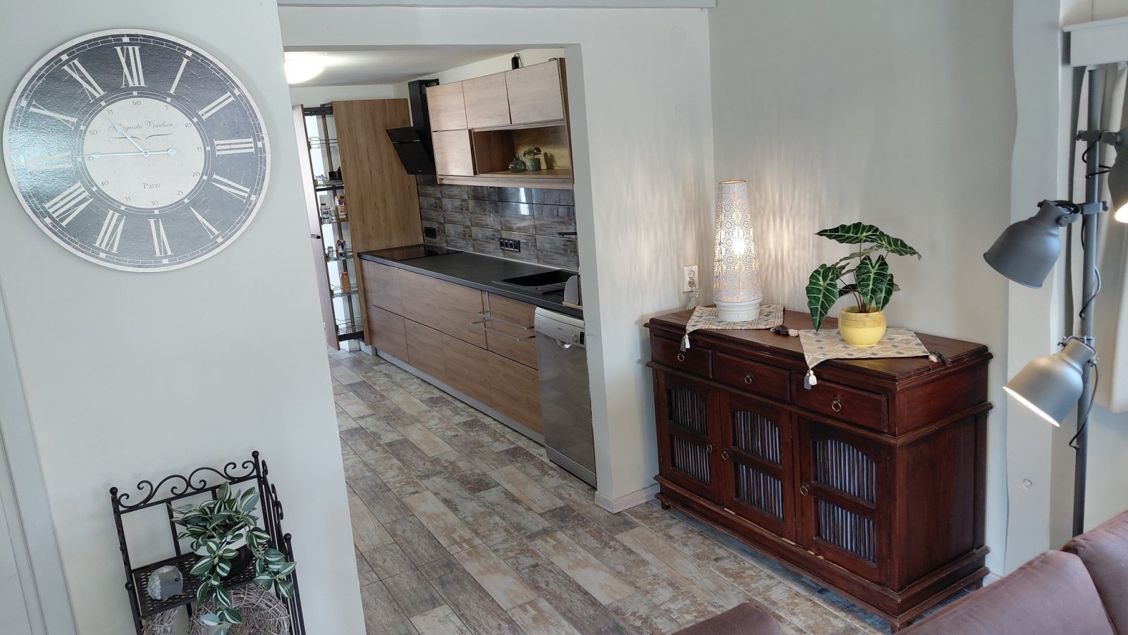 Der Flur führt in ein geräumiges und gemütliches Wohnzimmer. Dieses Wohnzimmer mit Kaminofen verfügt über eine Treppe, die zu einem Dachboden mit zwei Gästebetten und einem zusätzlichen Stauraum führt. Das Badezimmer ist auch vom Flur aus zugänglich.