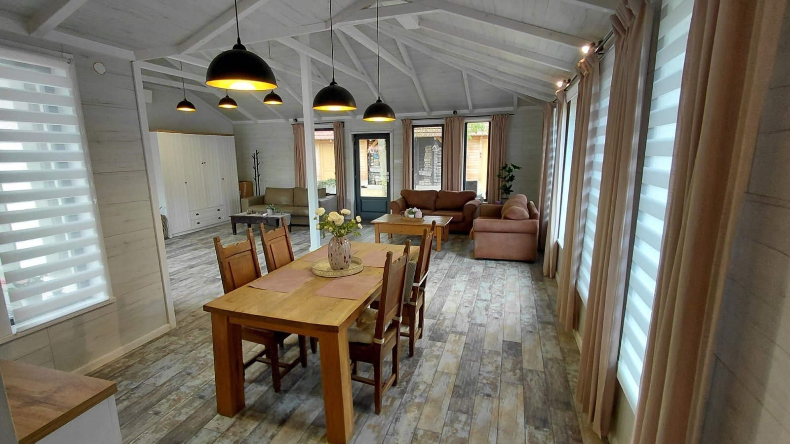 Sowohl der Flur als auch das Wohnzimmer führen in die geräumige, moderne und voll ausgestattete Küche. Außerdem gibt es einen großen, ca. 55 m², Raum mit hoher Decke. Dieser helle Raum hat auf beiden Seiten Türen nach draußen. Derzeit wird er als Esszimmer und zweites Wohnzimmer genutzt. Doch die Möglichkeiten sind vielfältig. Sie könnten hier zwei weitere Schlafzimmer, ein Klassenzimmer, einen Übungsraum oder ein Atelier einrichten. Oder wie wäre es, das erste Wohnzimmer als großes Schlafzimmer mit eigenem Bad zu nutzen? Lassen Sie Ihrer Fantasie freien Lauf.