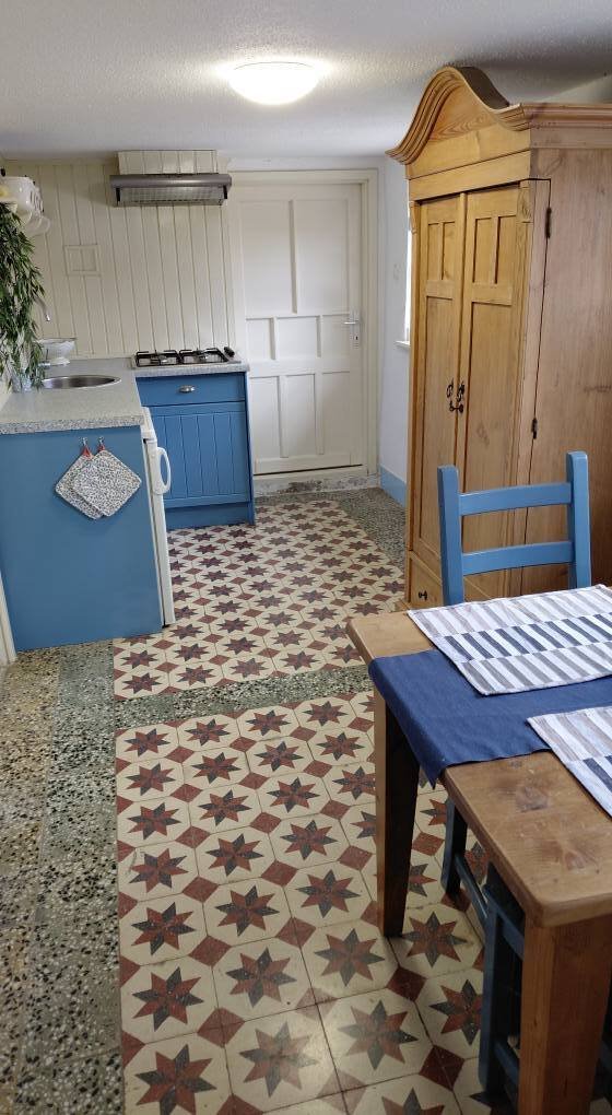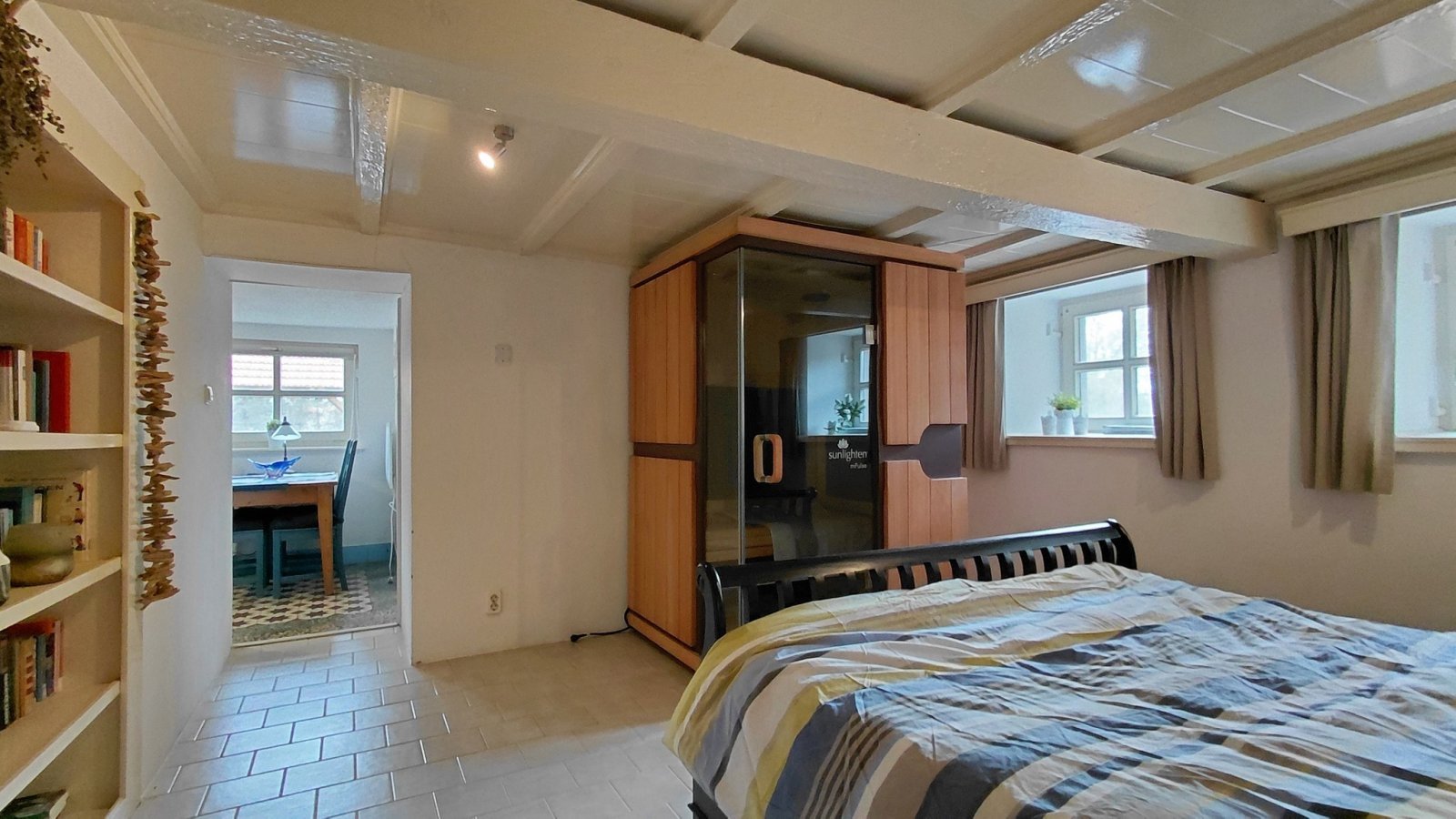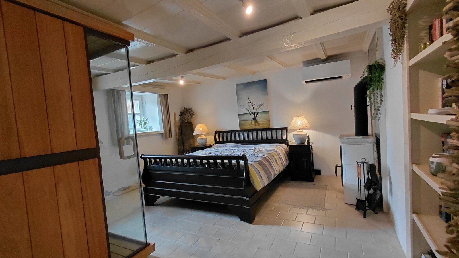 Eine Schiebetür führt in das alte Bauernhaus, in dem originale Details erhalten geblieben sind. Dort finden Sie eine Speisekammer/einen Keller, drei Schlafzimmer, eine kompakte Küche mit Essbereich und ein Badezimmer. Das Hauptschlafzimmer verfügt über eine Infrarotsauna, die die Eigentümerin mitbringen möchte.