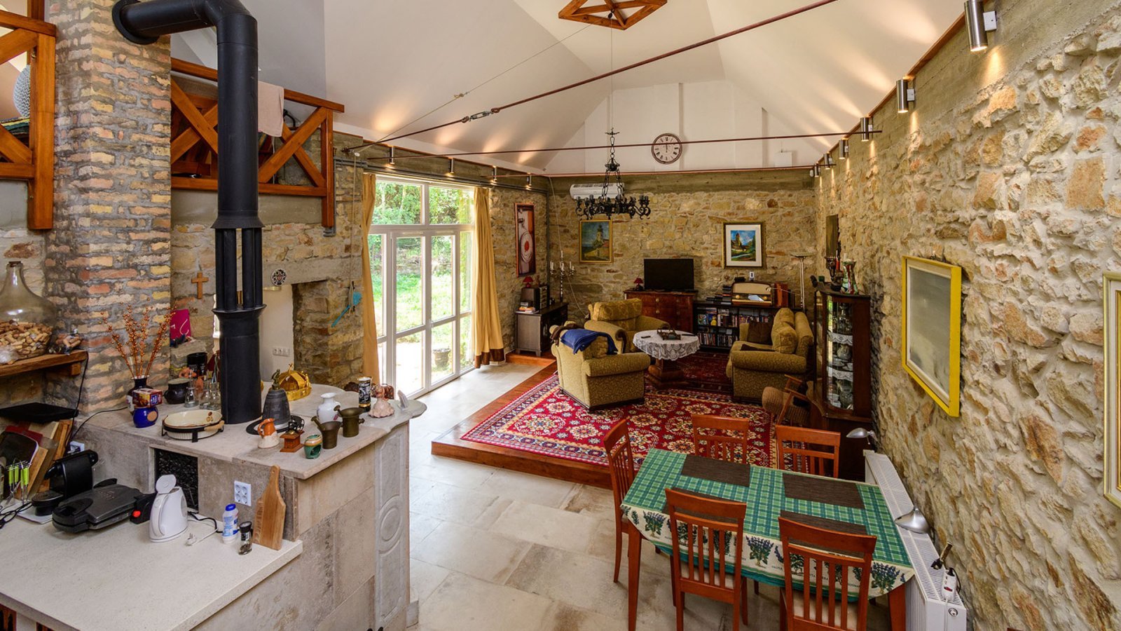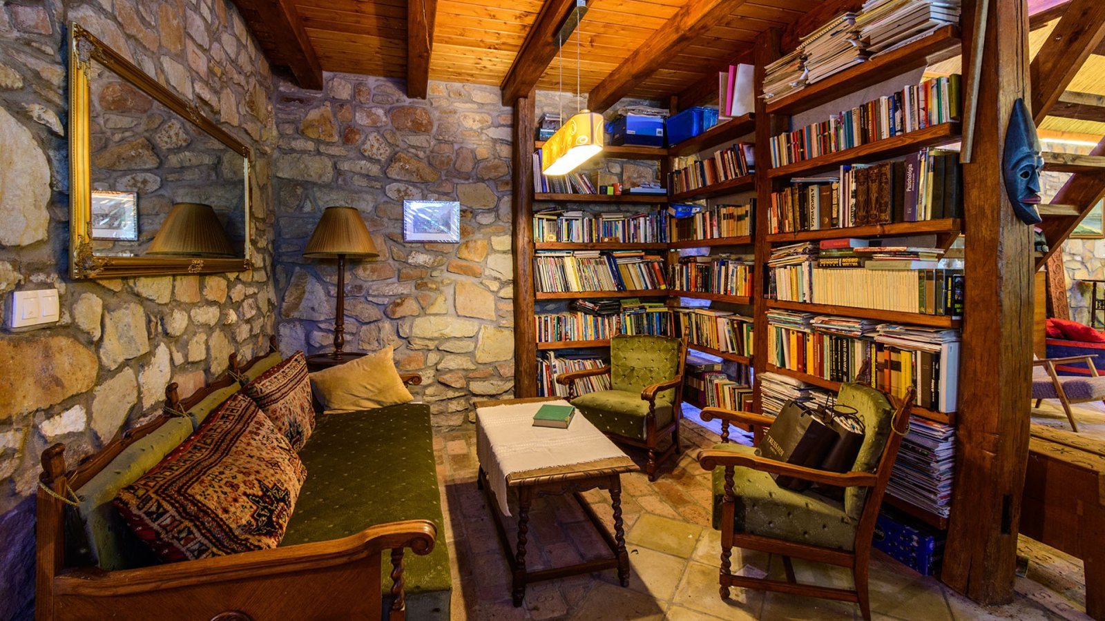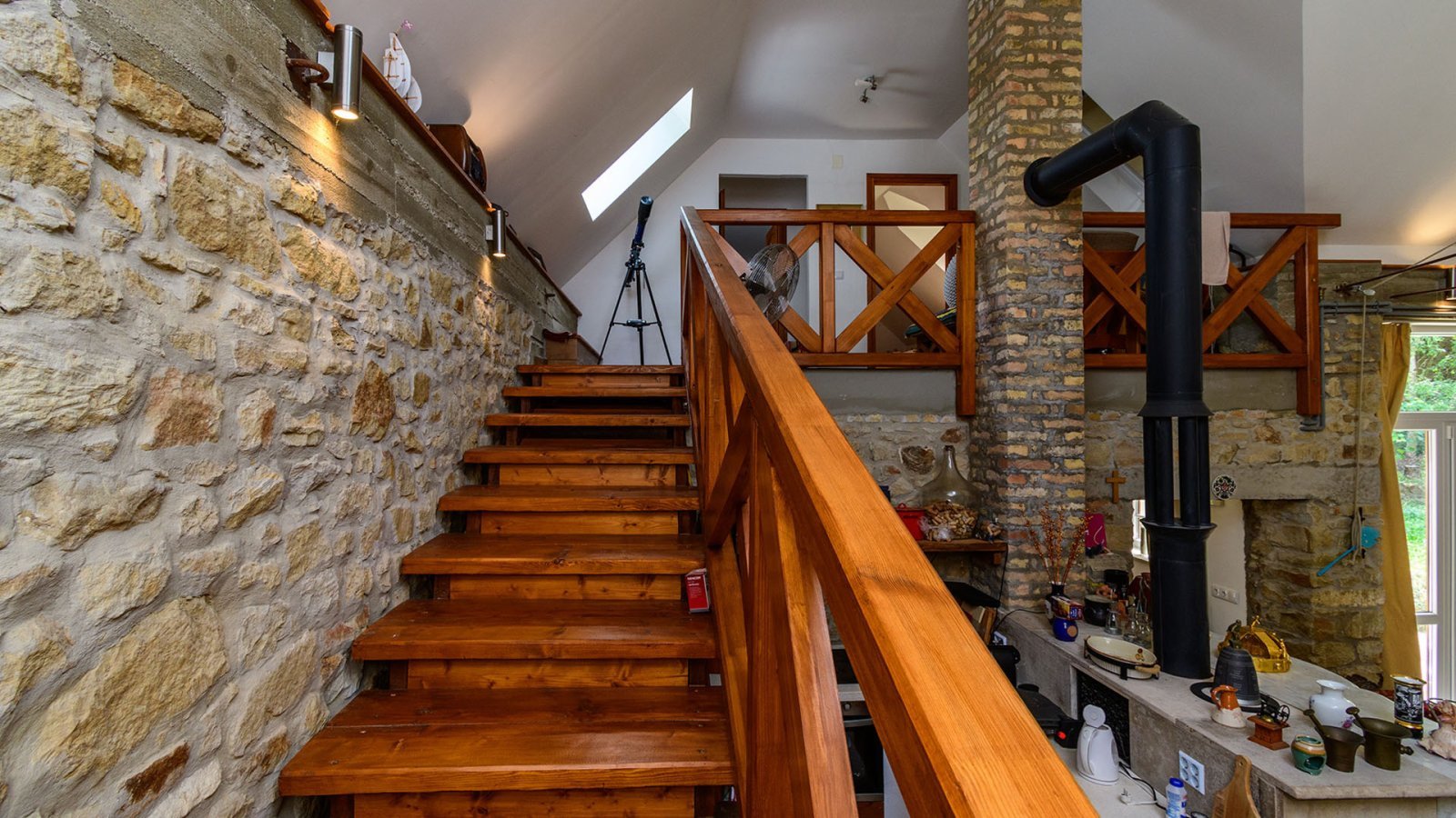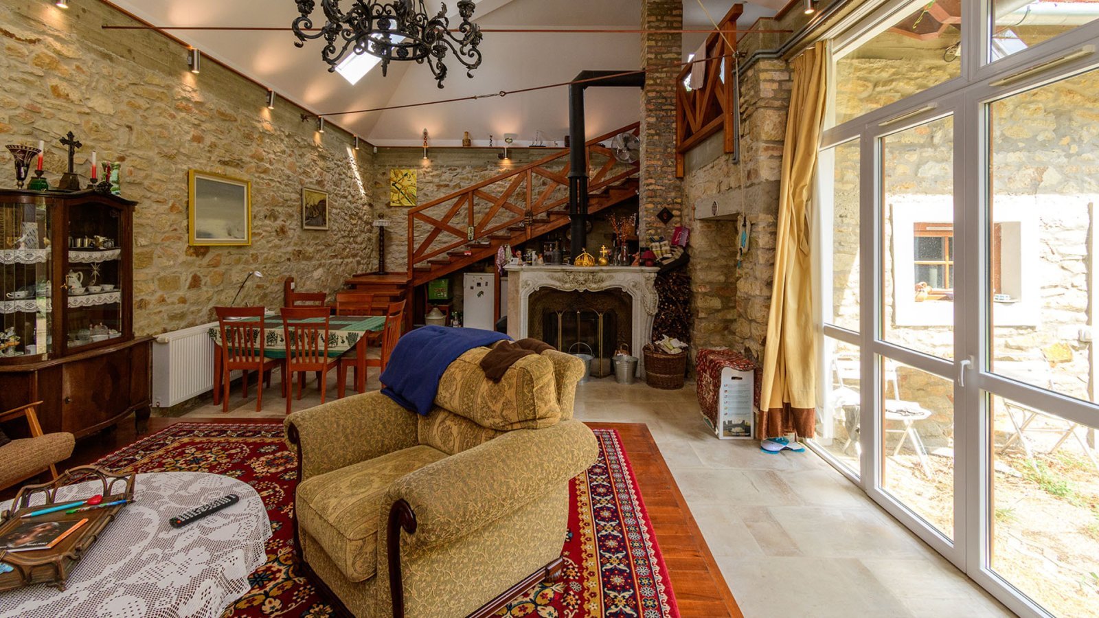 Für die besondere Atmosphäre des Hauses sorgen die Holzelemente und die Steinmauern.