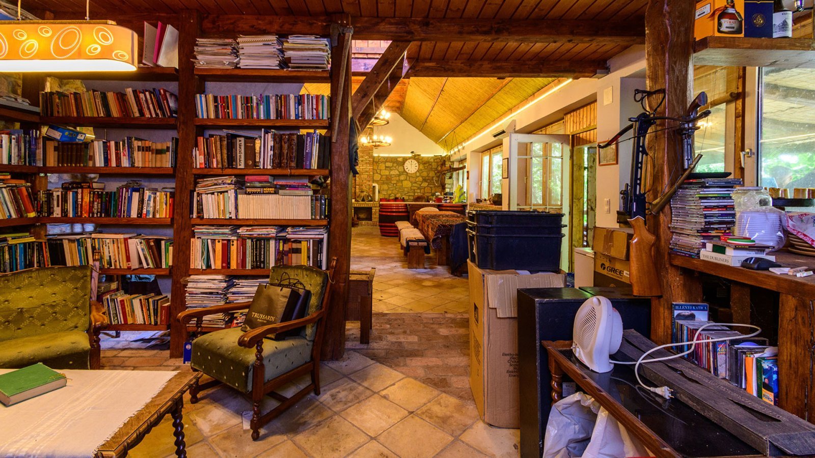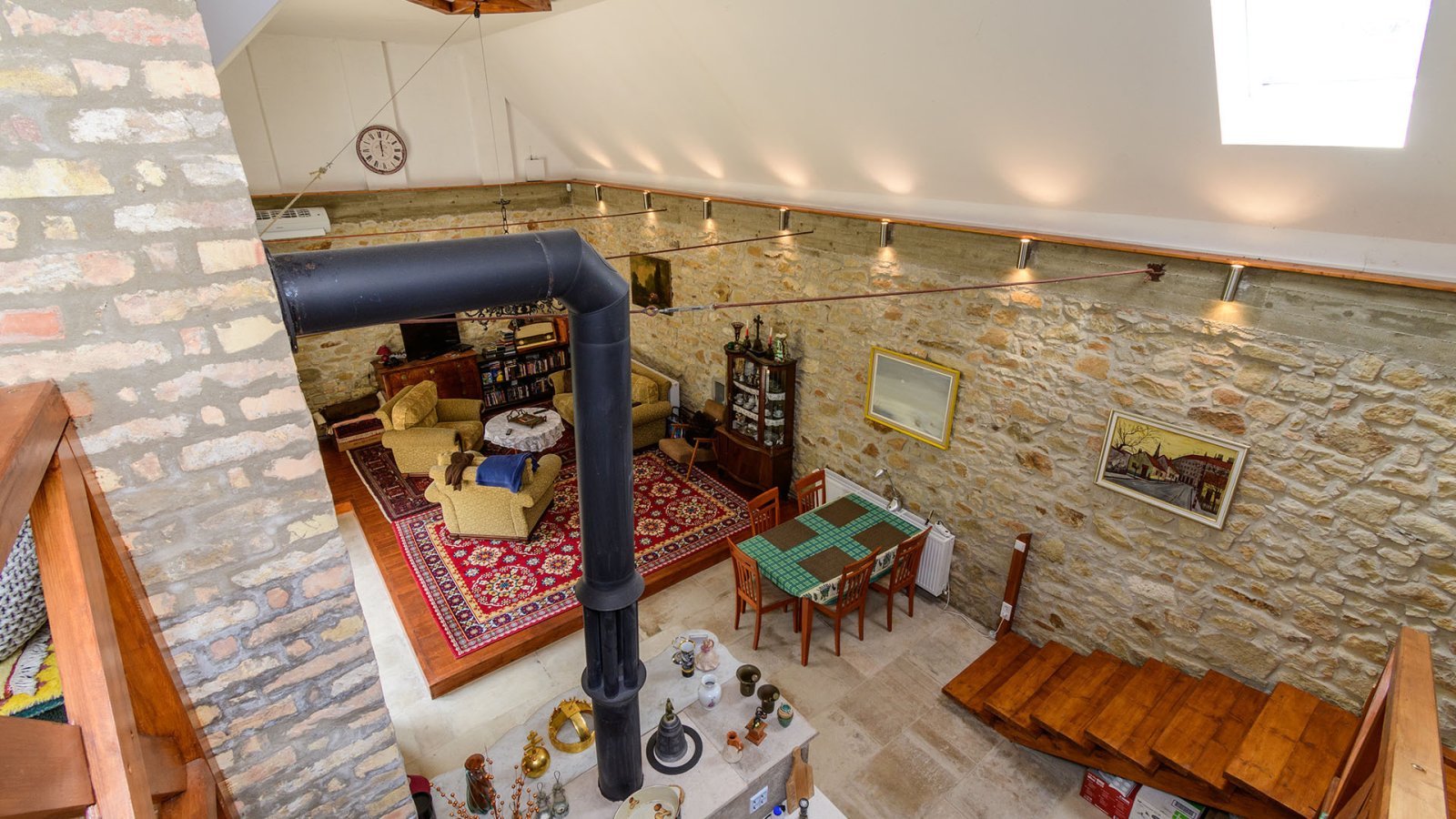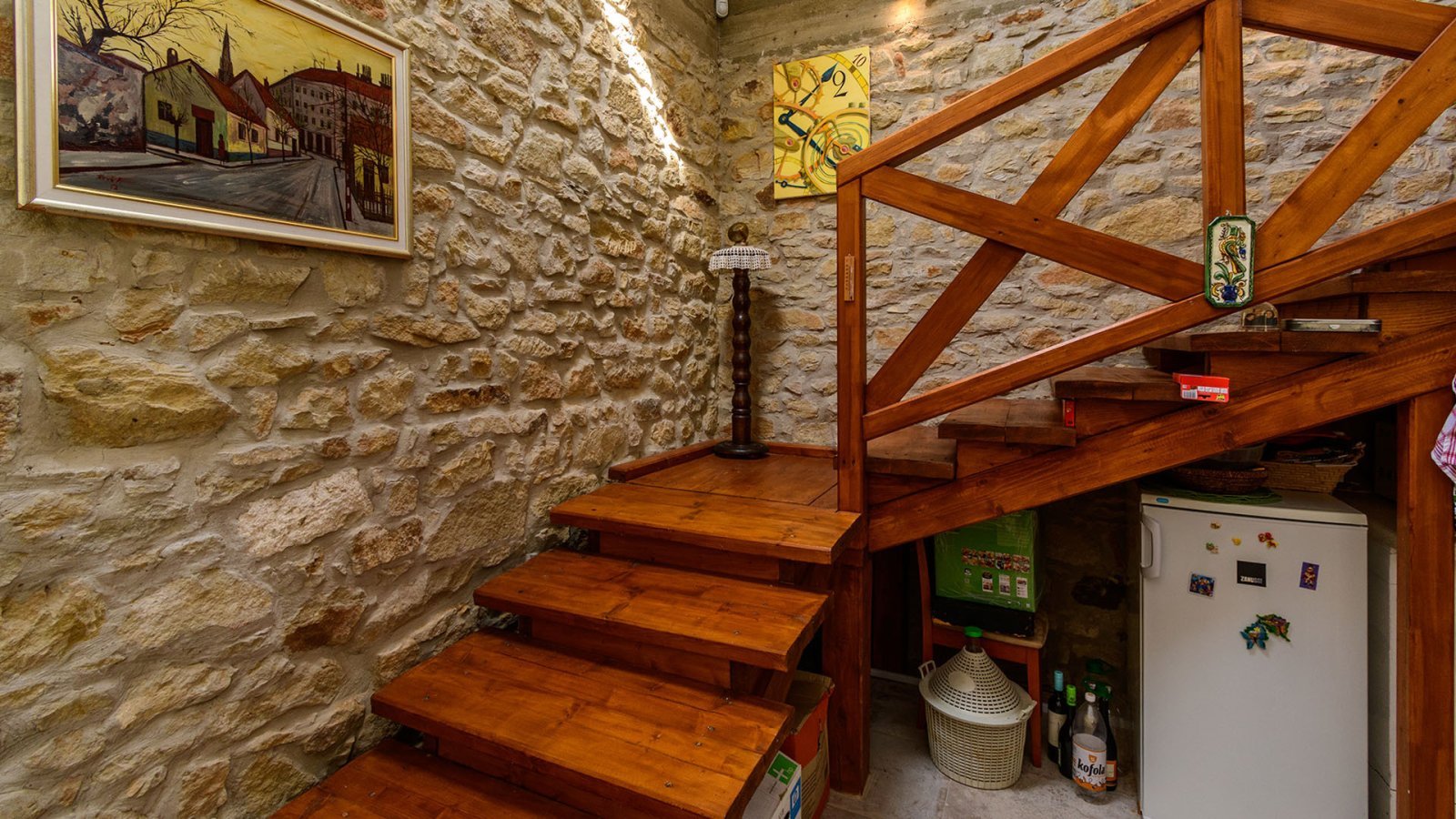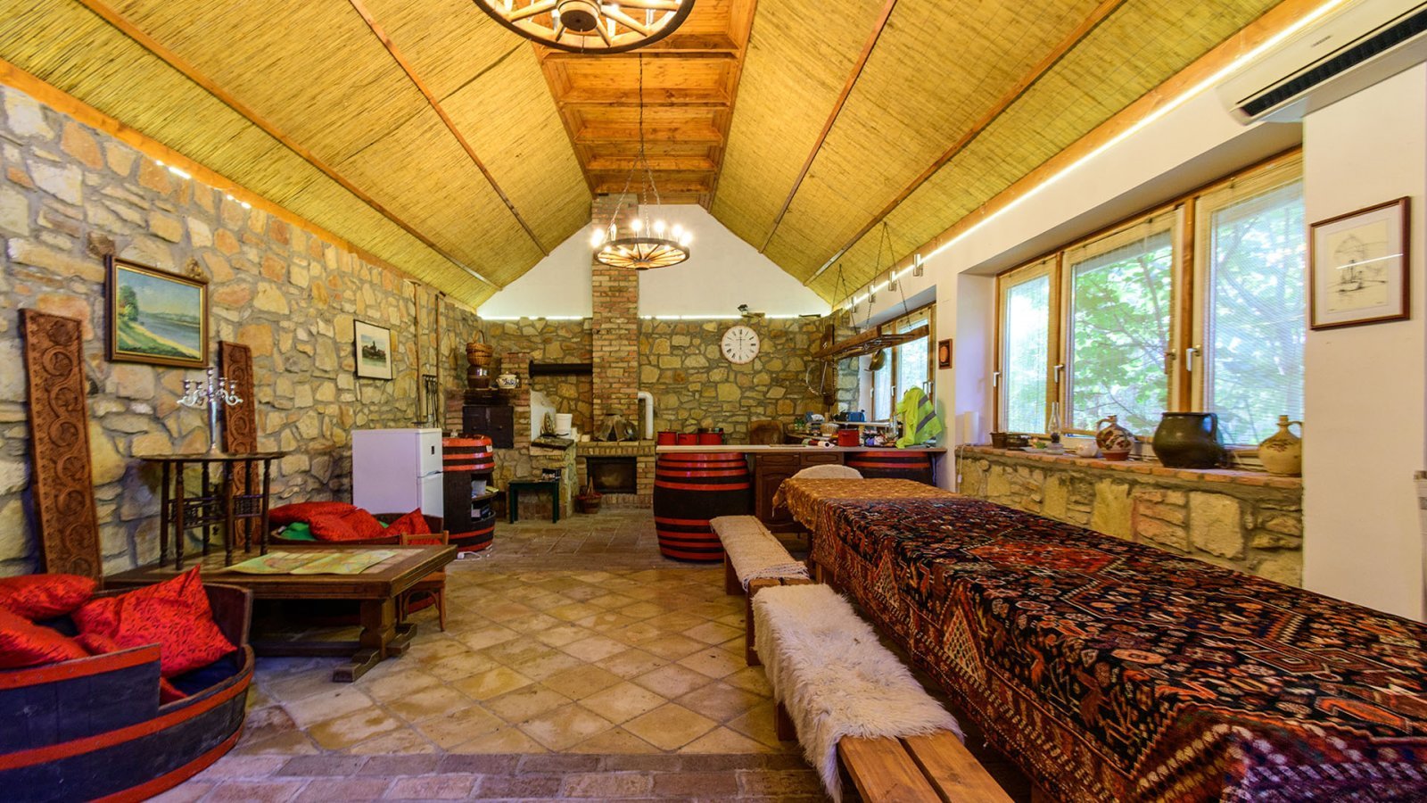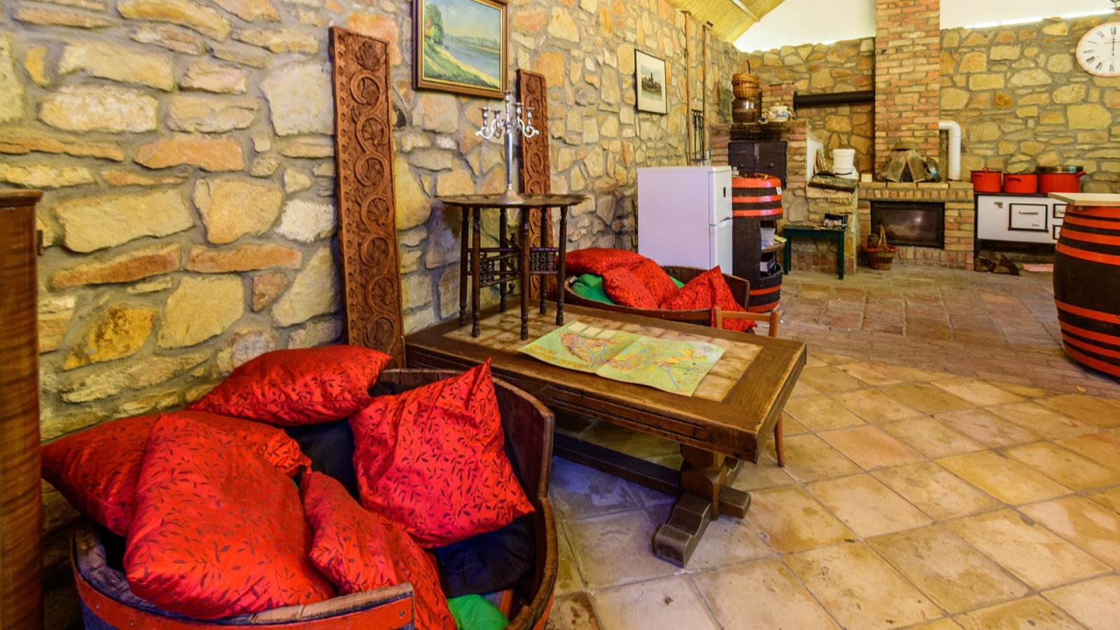 Für die besondere Atmosphäre des Hauses sorgen die Holzelemente und die Steinmauern.