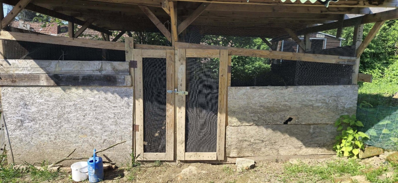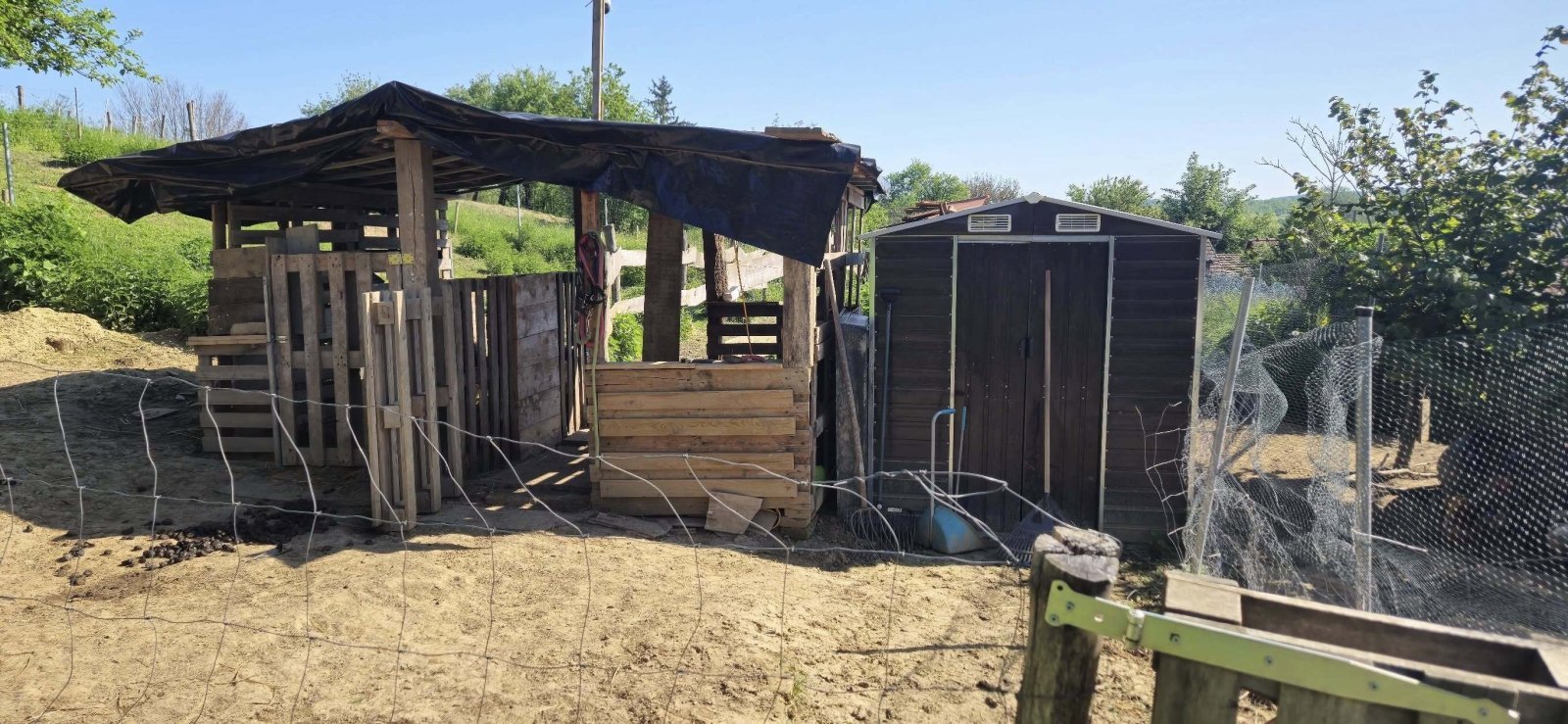 Kleintierhaltung: Ein funktionaler Schweinestall mit Auslauf und ein separater Hühnerstall mit Auslauf.