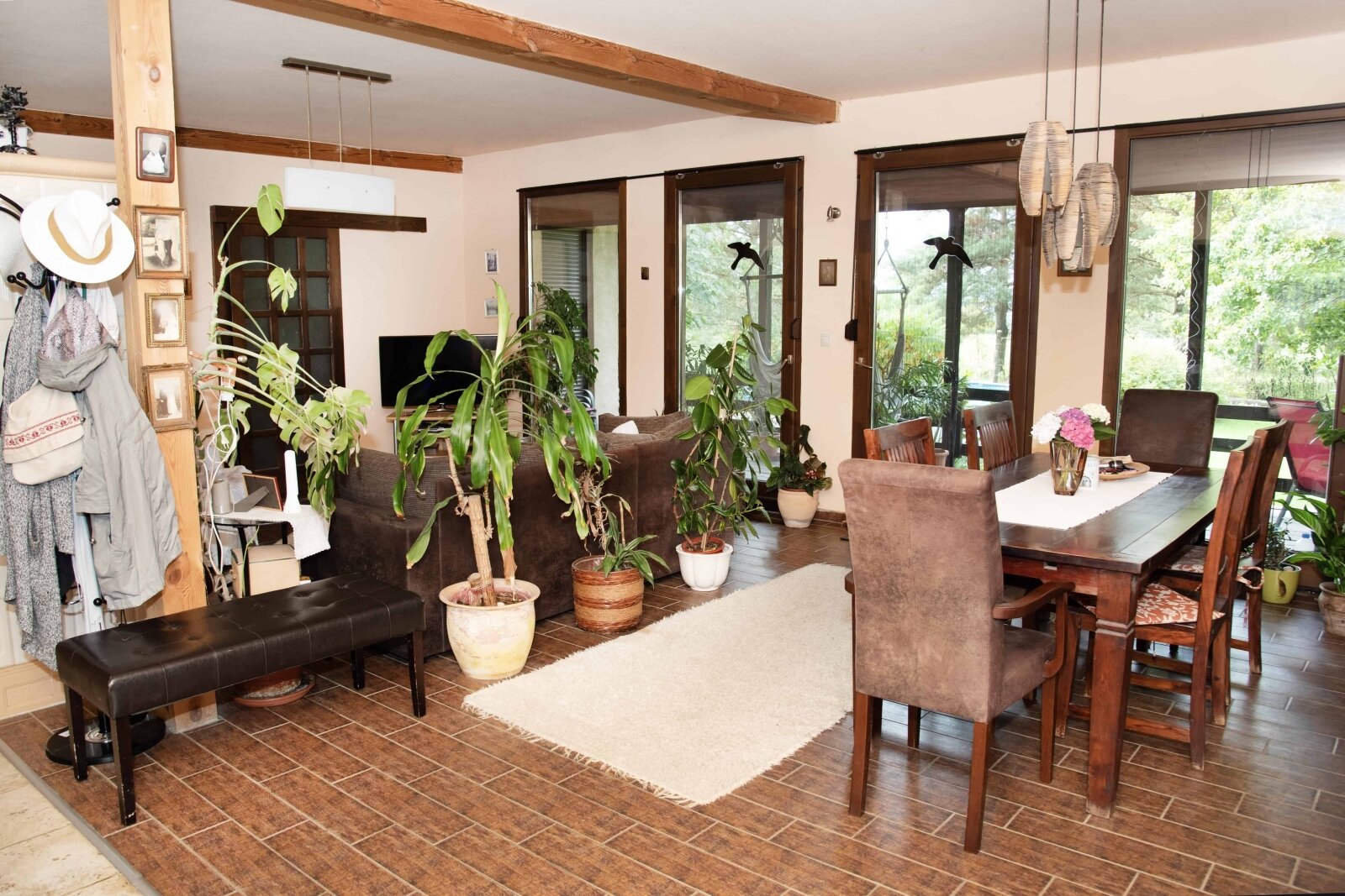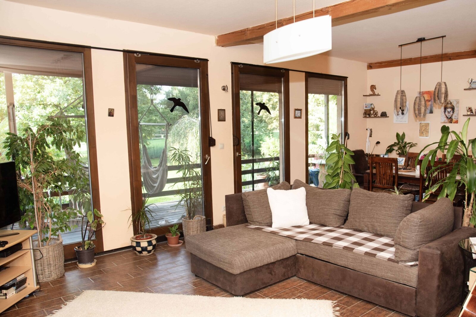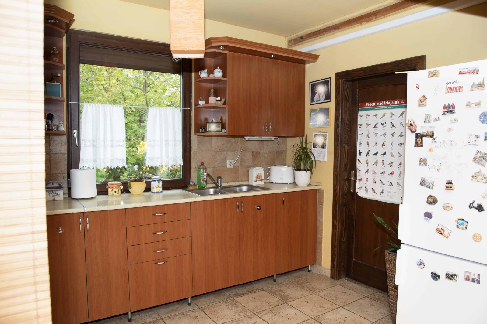 Auf dem Grundstück befindet sich ein 140 m2 großes Wohnhaus in hochwertiger Leichtbauweise, das dank ausgezeichneter Dämmung und durchdachter Raumaufteilung ein behagliches Wohngefühl vermittelt. Es verfügt über zwei Schlafzimmer, einen großzügigen Wohn-Essbereich mit Kachelofen, Speisekammer, Garderobenzimmer und ein Badezimmer. Die große Holzdeck-Terrasse eröffnet einen atemberaubenden Blick auf die süd-zalai Hügellandschaft.