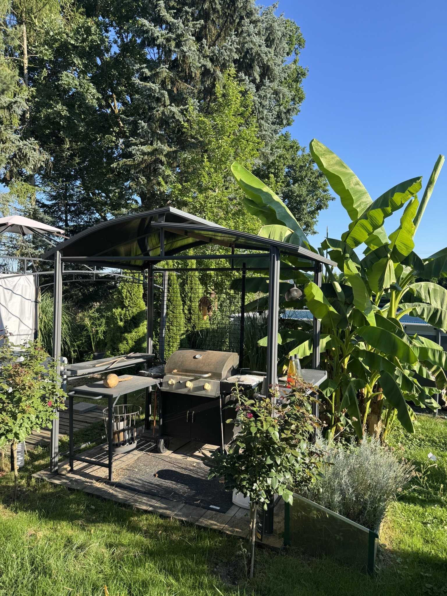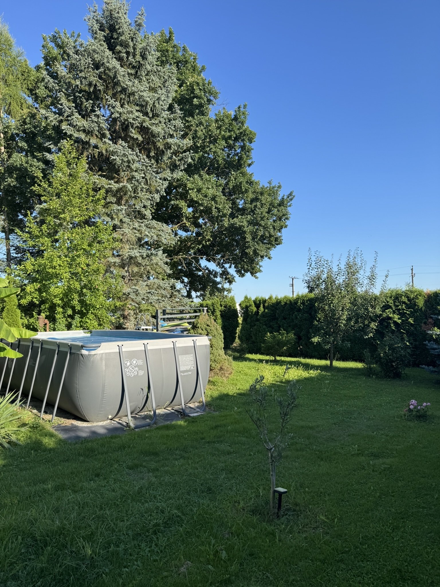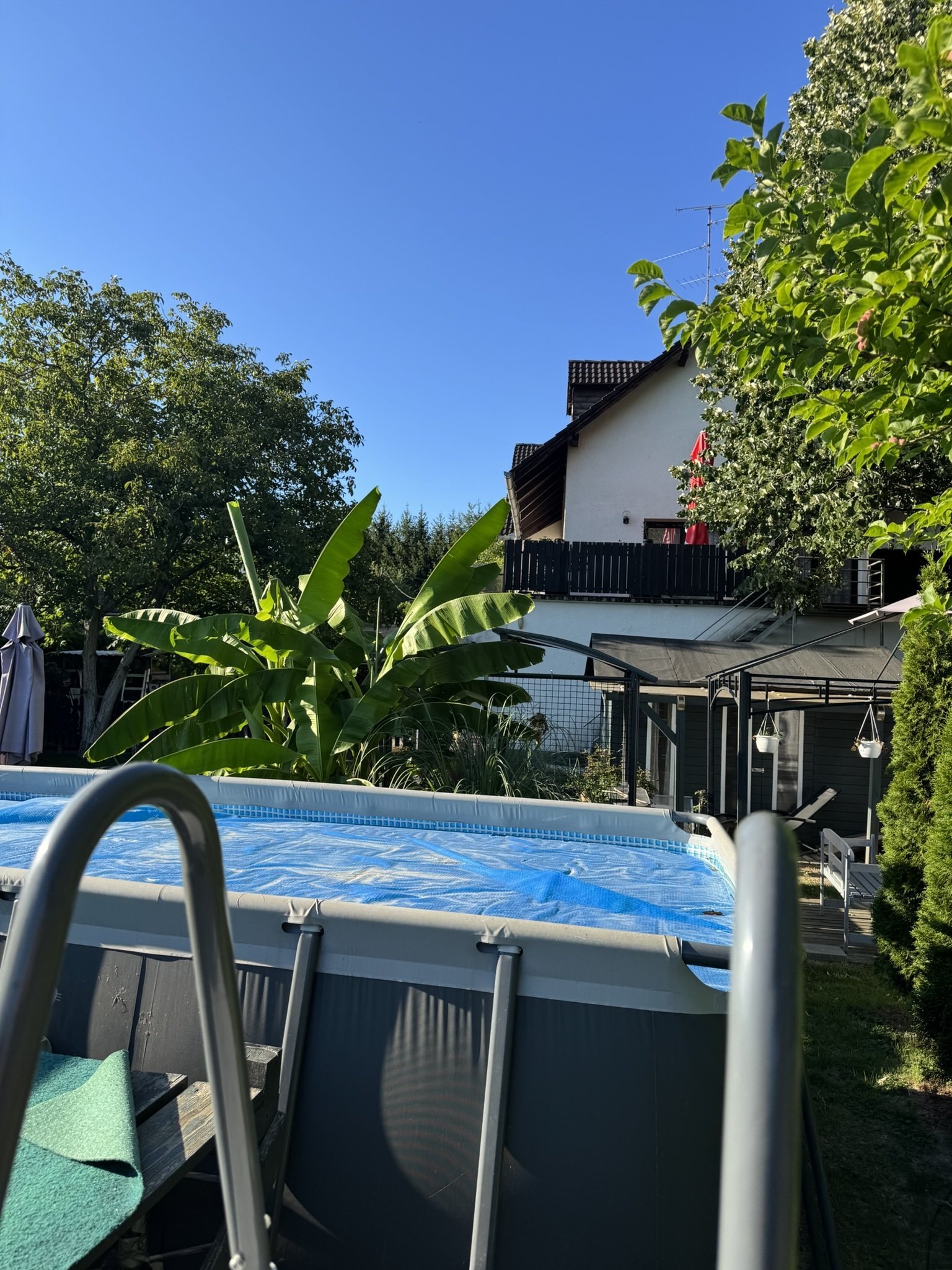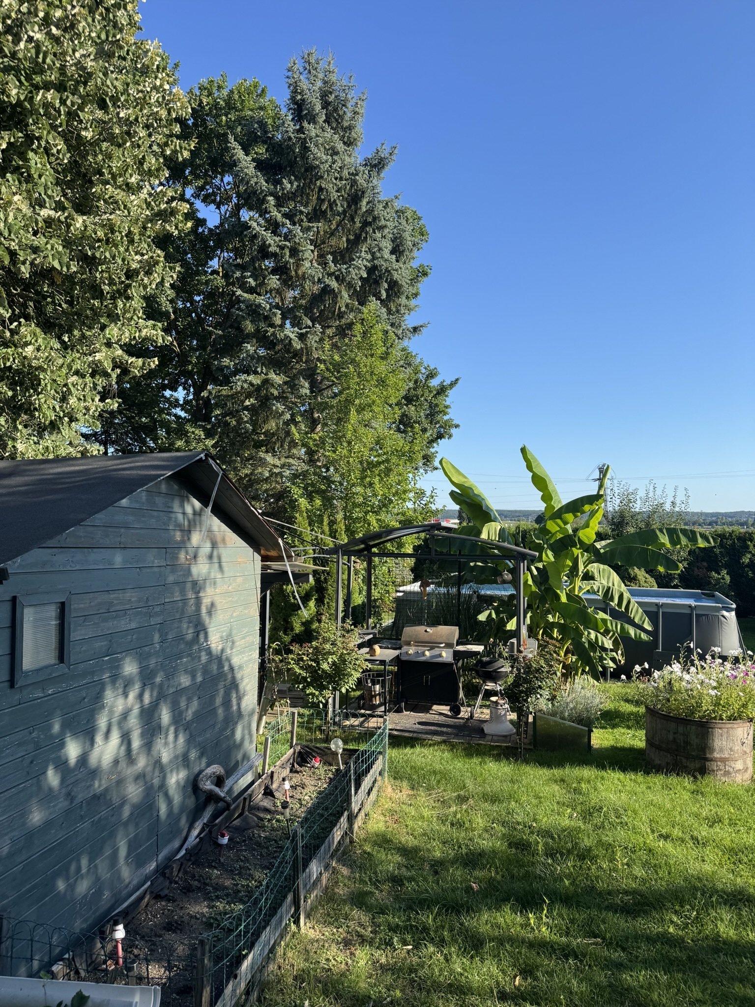 Der 1300 m² große Garten ist wunderschön angelegt und dank einer Reihe von Thujabäumen absolut blickdicht. Zusätzlich gibt es ein Holzschuppen, eine finnische Sauna und einen Außenpool. Zur Straße hin bietet das Grundstück einen gepflasterten Carport für zwei Autos und Stellplätze für drei bis vier weitere Fahrzeuge.