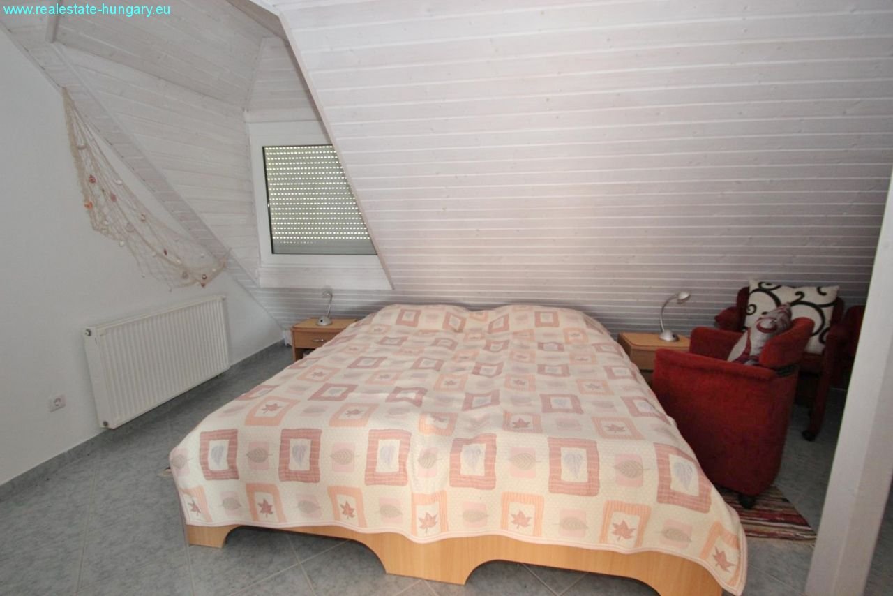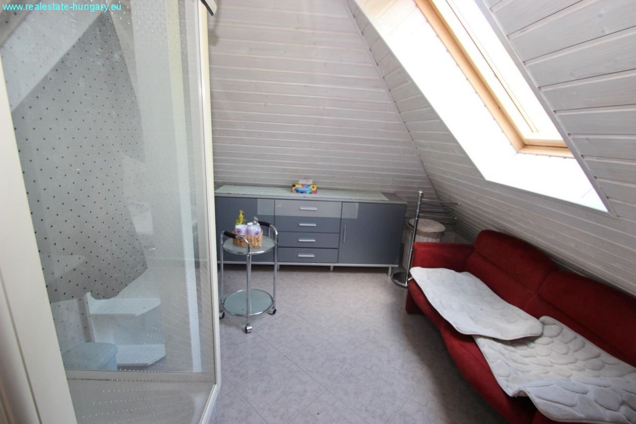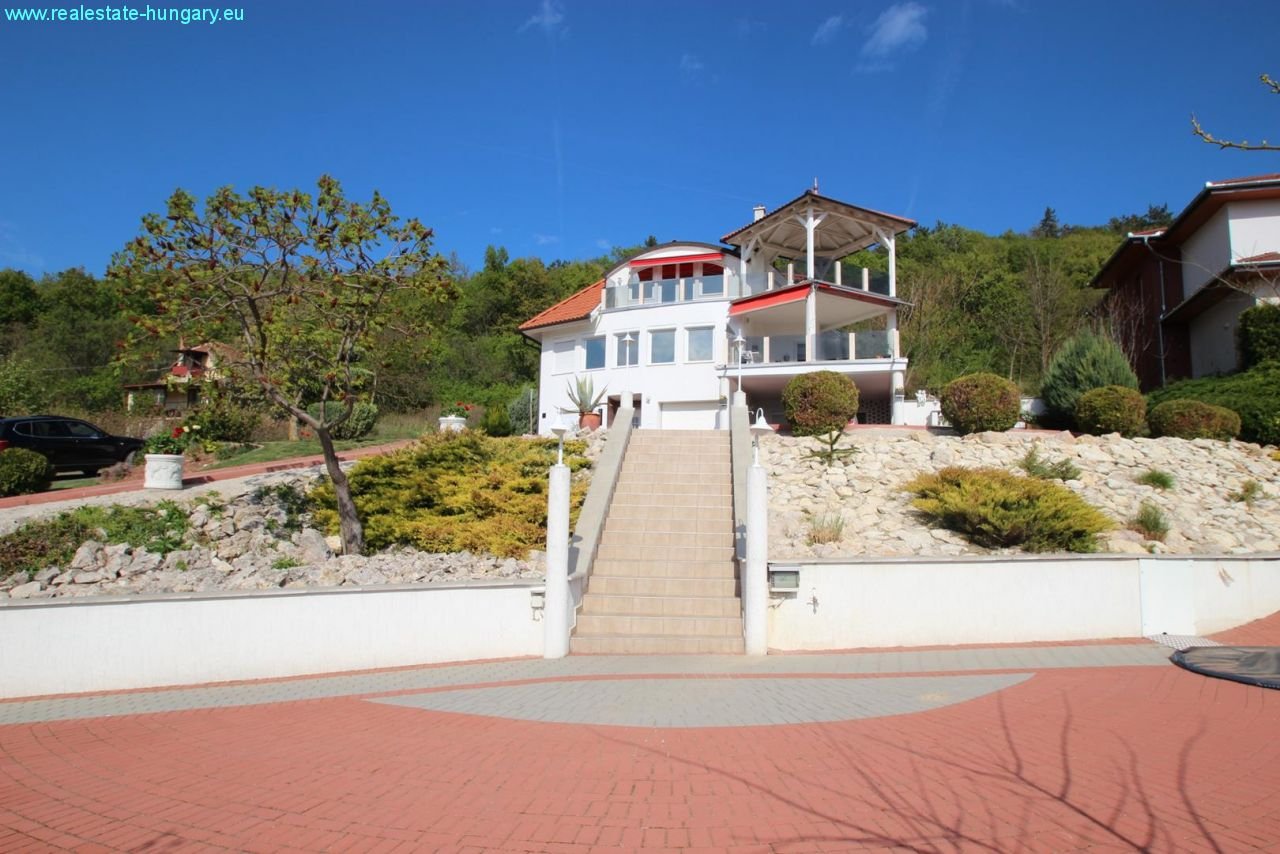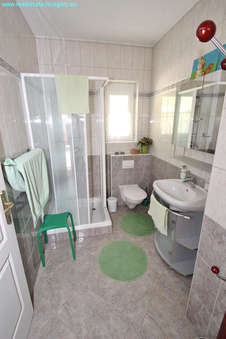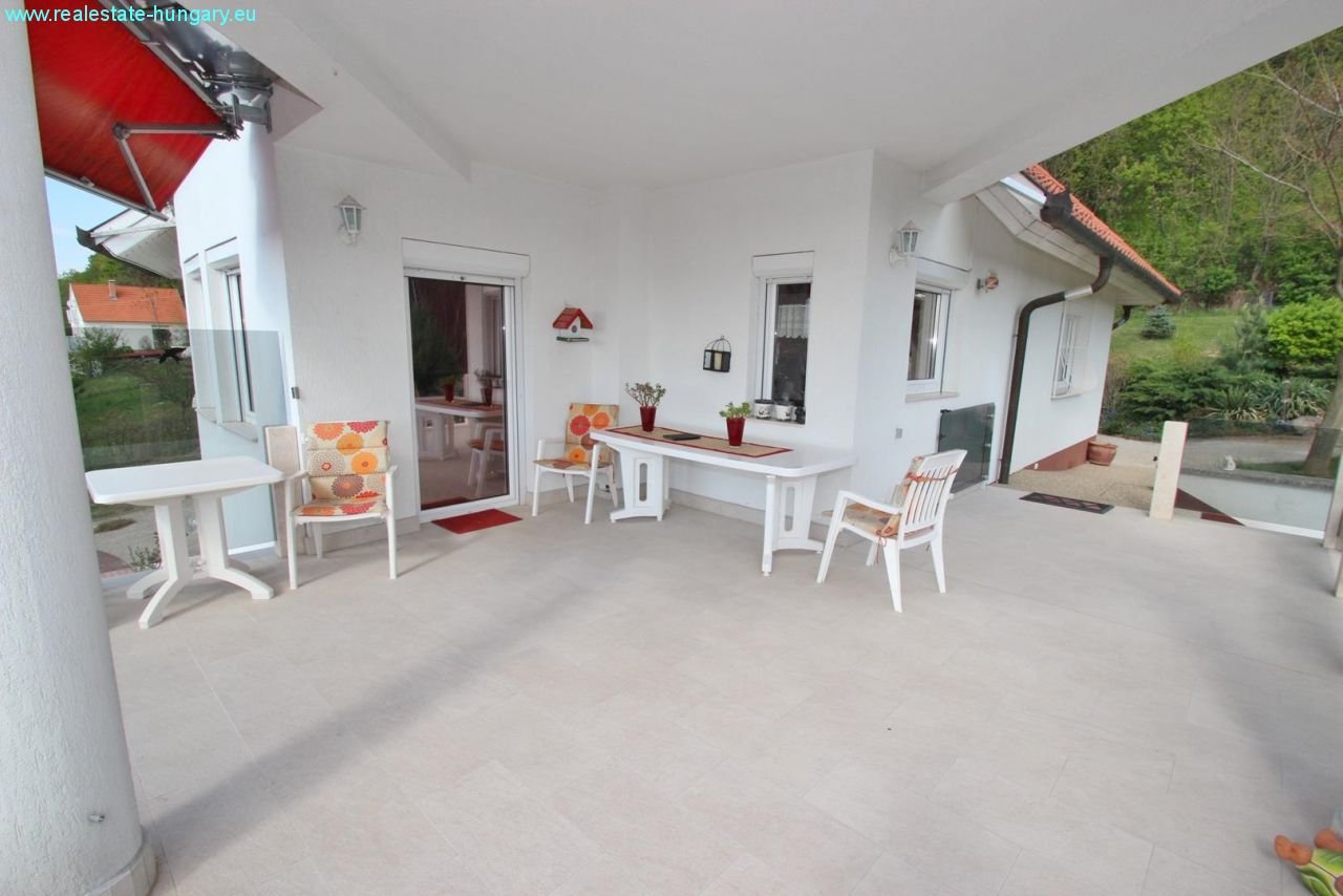 das sehr großzügig gebaute Massivhaus besticht schon durch die exponierte Lage, die moderne Einrichtung, die Nähe zu Balaton und Thermal und zahlreiche, weitere Ausstattungsdetails: Gaszentralheizanlage mit Fußbodenheizung und Radiatoren, automatisches Garagentor, Alarmanlage, ausgedehnte, windschutzverglaste und teilüberdachte Terrasse und Balkon mit zusammen 70 m², Einbauküchen mit Geräten, weitläufig gepflasterte Einfahrts- und Parkflächen, schöner Grillplatz mit gemauerten Grill- und Sitzbereichen, Regenwasserzisterne mit 15 m³ Fassungsvermögen, großformatige, getönte Isolierglasfenster, sehr gepflegte Gartenanlage mit Ziergewächsen. Das Obergeschoß kann als separate Wohnung genutzt werden. Top Anlageobjekt!!!