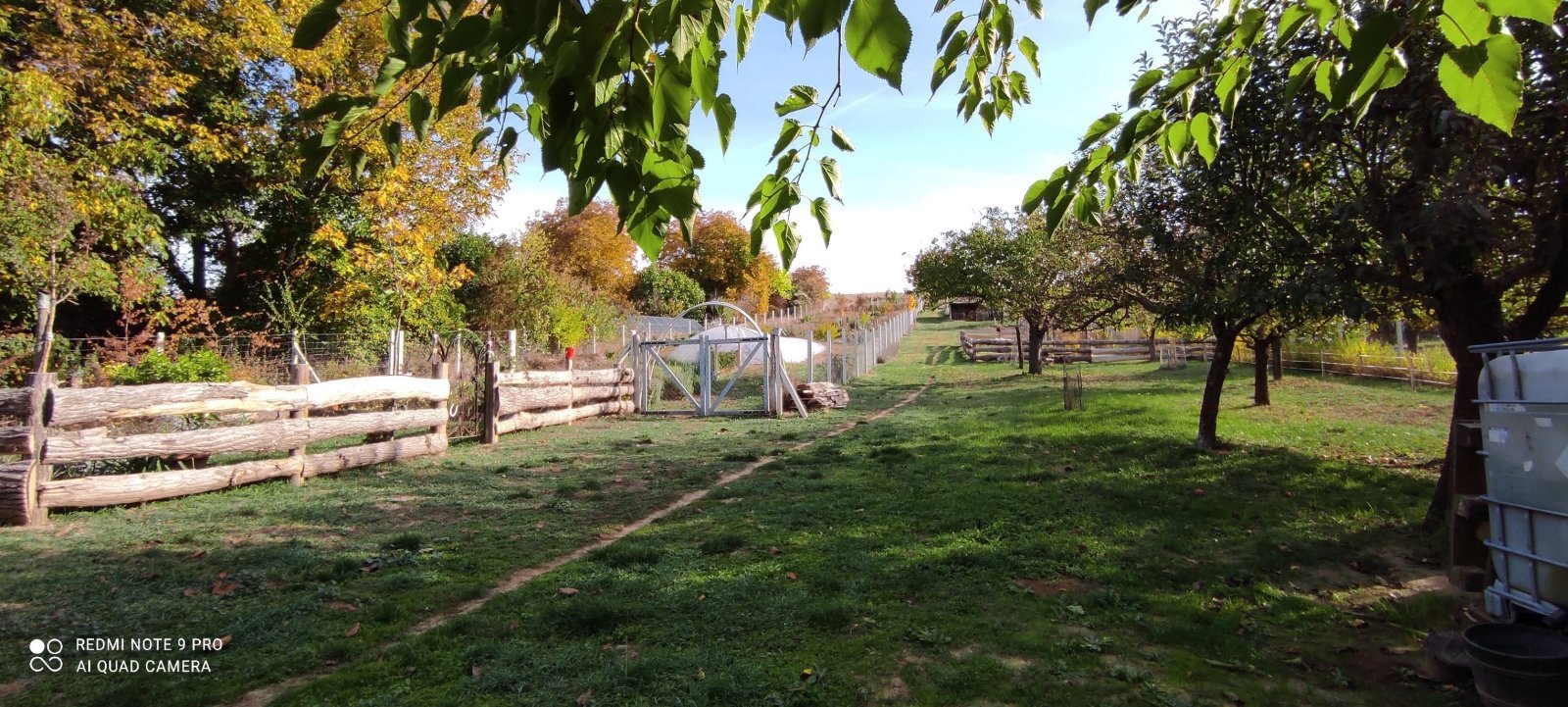 Die andere Hälfte ist von einer Hecke umgeben, die mit der Zeit einen dichten Zaun bildet. Das gesamte Grundstück wird bewirtschaftet mit Obstbäumen, schattenspendenden Zierbäumen, Sträuchern und Beerensträuchern.