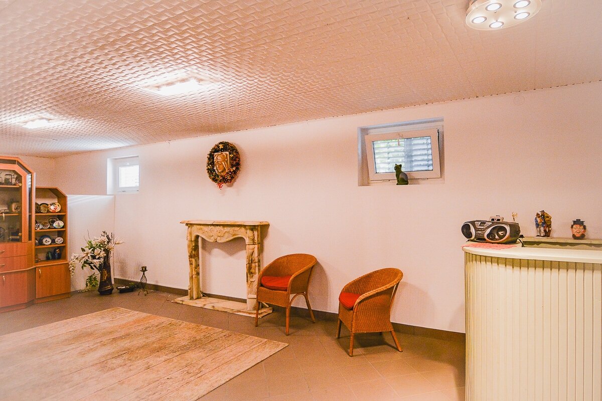 Raumaufteilung: EG. 220,0 qm: Wohnzimmer, Vorraum, Badezimmer, Speisekammer, Zimmer, Zimmer, Zimmer, Küche+Eßzimmer, Badezimmer+WC. Terrasse 60,0 qm. Souterrain 230,0 qm: Sauna-Raum, Werkstatt, Hobby-Raum, Hobby-Raum, Hobby-Raum, Toilette. Autoabstellplatz 50,0 qm.