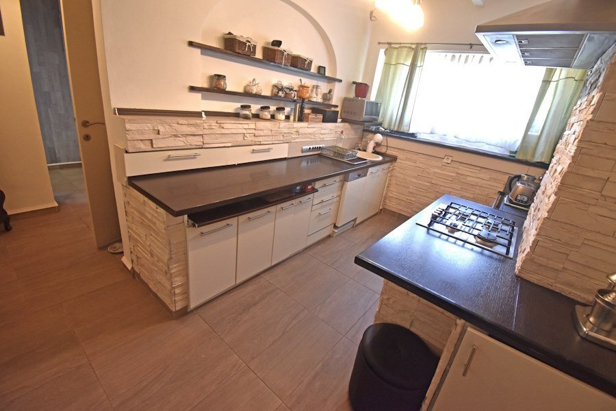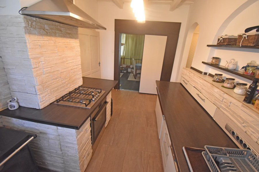 Für Abwasser steht eine Sickergrube zur Verfügung. Die Heizung ist Stromheizung + in der Küche ein Sparherd, und ein Ofen im Wohnzimmer, damit kann man fast den ganzen unteren Teil heizen.