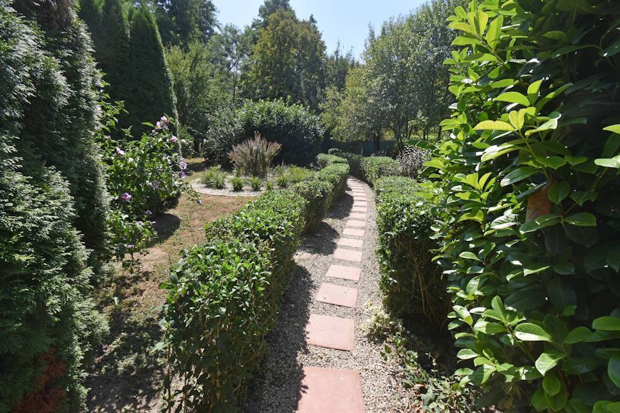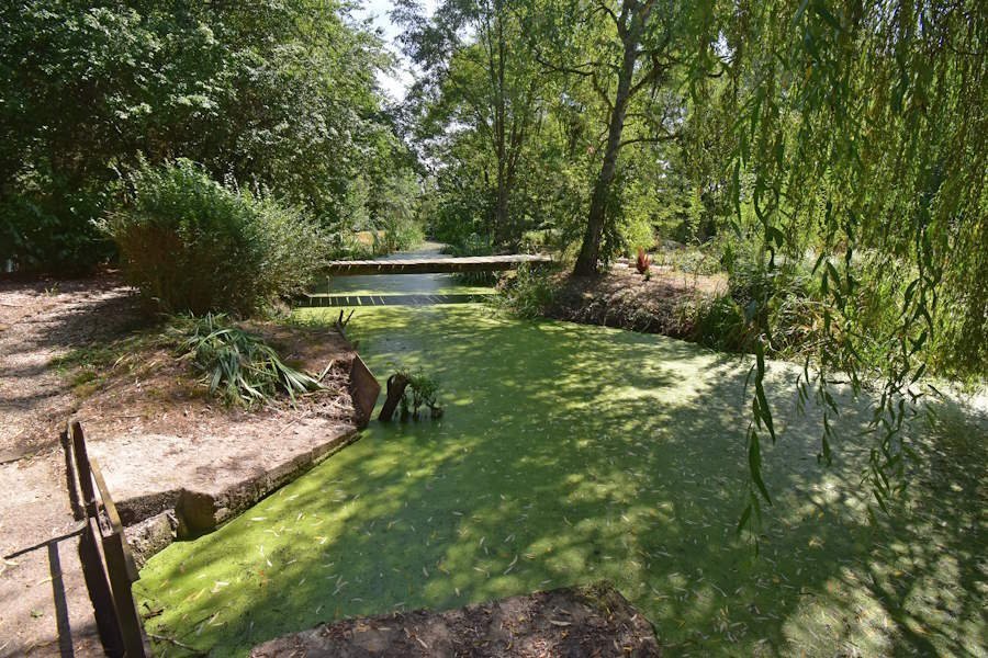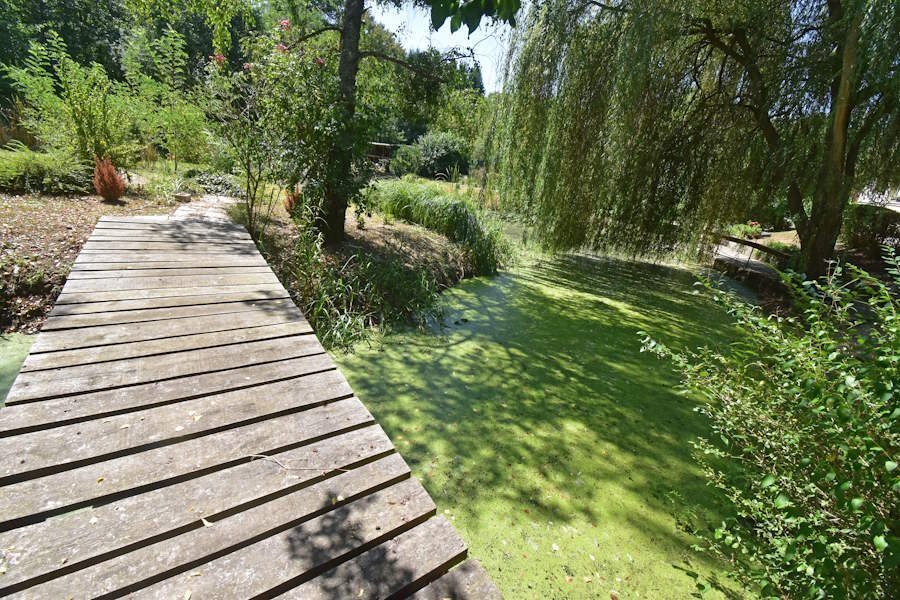 Das wunderschön angelegte Grundstück ist 2.863 m² groß. Der See auf dem Grundstück wird von einem Bach gefördert und eine Holzbrücke führt zur gemütlichen Insel. Am See haben einige Wildenten, Reiher und andere Wasservögel Heim.