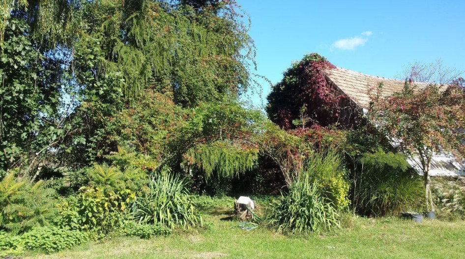 Trauerweiden, Birke, Lärche, Mammutbaum u.a. Der Garten ist nicht einsehbar und hat 2 Brunnen.