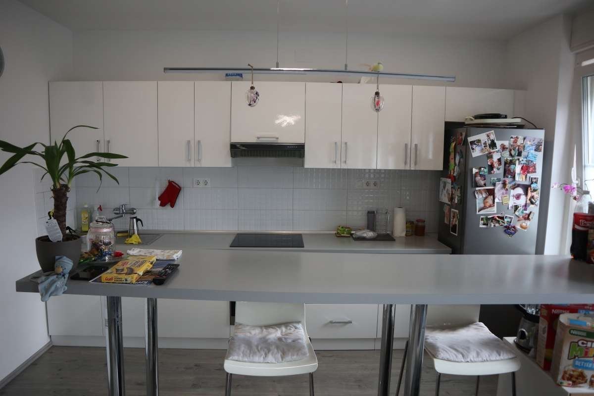 Eine neue, hochglänzende Einbauküche mit modernen Geräten wurde installiert.