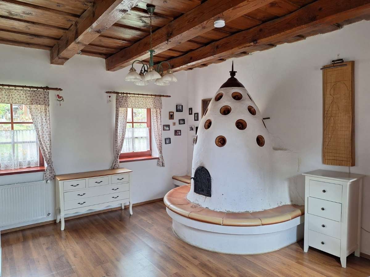 Am westlichen Ende des Flurs gelangt man in ein größeres Zimmer. Hier befindet sich das Juwel des Hauses: ein von einer keramischen Künstlerin gestalteter, mit alten ungarischen Motiven verzierter Ofen, der nicht nur als Heizung, sondern auch zur Zubereitung von Backgerichten geeignet ist.