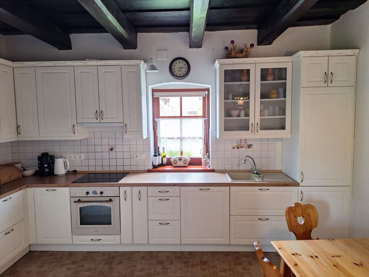 Durch die dreieckige Fassade tritt man über eine auf Säulen ruhende Veranda in einen Flur ein, von dem alle Räume des Hauses abgehen. Gegenüber der Eingangstür befindet sich die geräumige Küche, ausgestattet mit einer 2021 gefertigten Küchenzeile, einem eingebauten Elektroherd, Geschirrspüler und Kühlschrank.