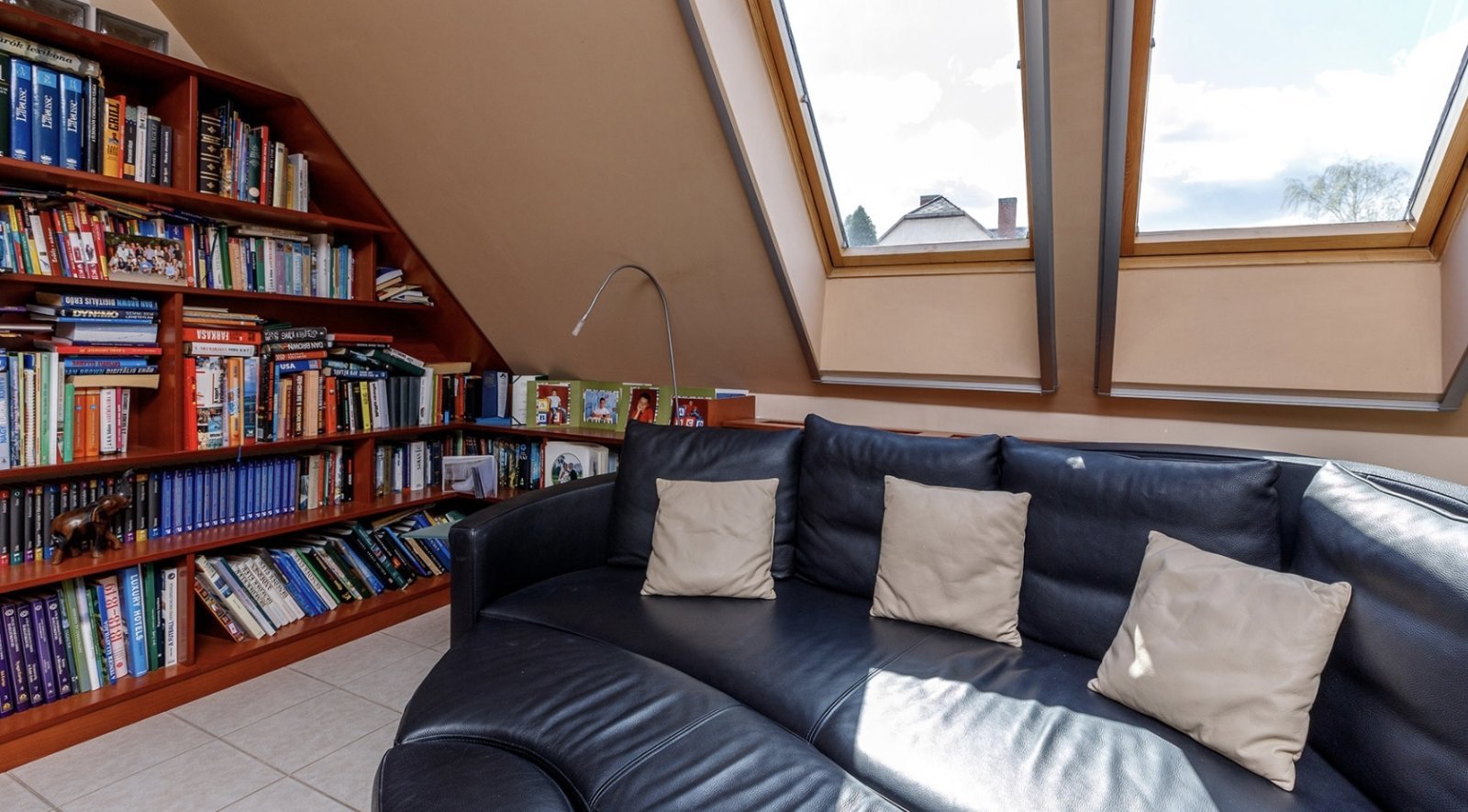 Im Obergeschoss: Wohnzimmer, Badezimmer, Waschküche, Flur, Arbeitszimmer, 2 Schlafzimmer, eines davon mit Balkon.
