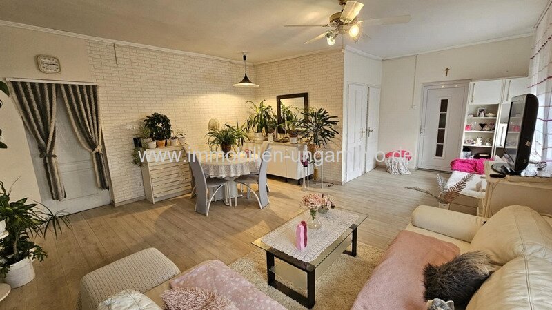 In einer kleinen Stadt in der Nähe des Plattensees biete ich ein 125 m² großes Einfamilienhaus mit einem 955 m² großen umzäunten Grundstück zum Verkauf an. Räume: Wohnzimmer, 3 Schlafzimmer, 2 Bäder, 2 Toiletten, Diele, Küche, Esszimmer, Wintergarten, überdachte Terrasse. Im Nebengebäude Sommerküche, Esszimmer, Gästezimmer, Abstellraum. An das Haus angebaut ist ein 70 m² großer Raum mit Doppelgarage, Heizungsraum, Holzlagerraum und Garderobe. Im hinteren Nebengebäude gibt es Abstellräume und eine separate Garage. Der Hof ist grasbewachsen, aufgeräumt, ein wunderschöner Gartenteich wurde angelegt, es gibt auch einen gegrabenen Brunnen. Der hintere Garten ist Obstgarten und Gemüsegarten.
