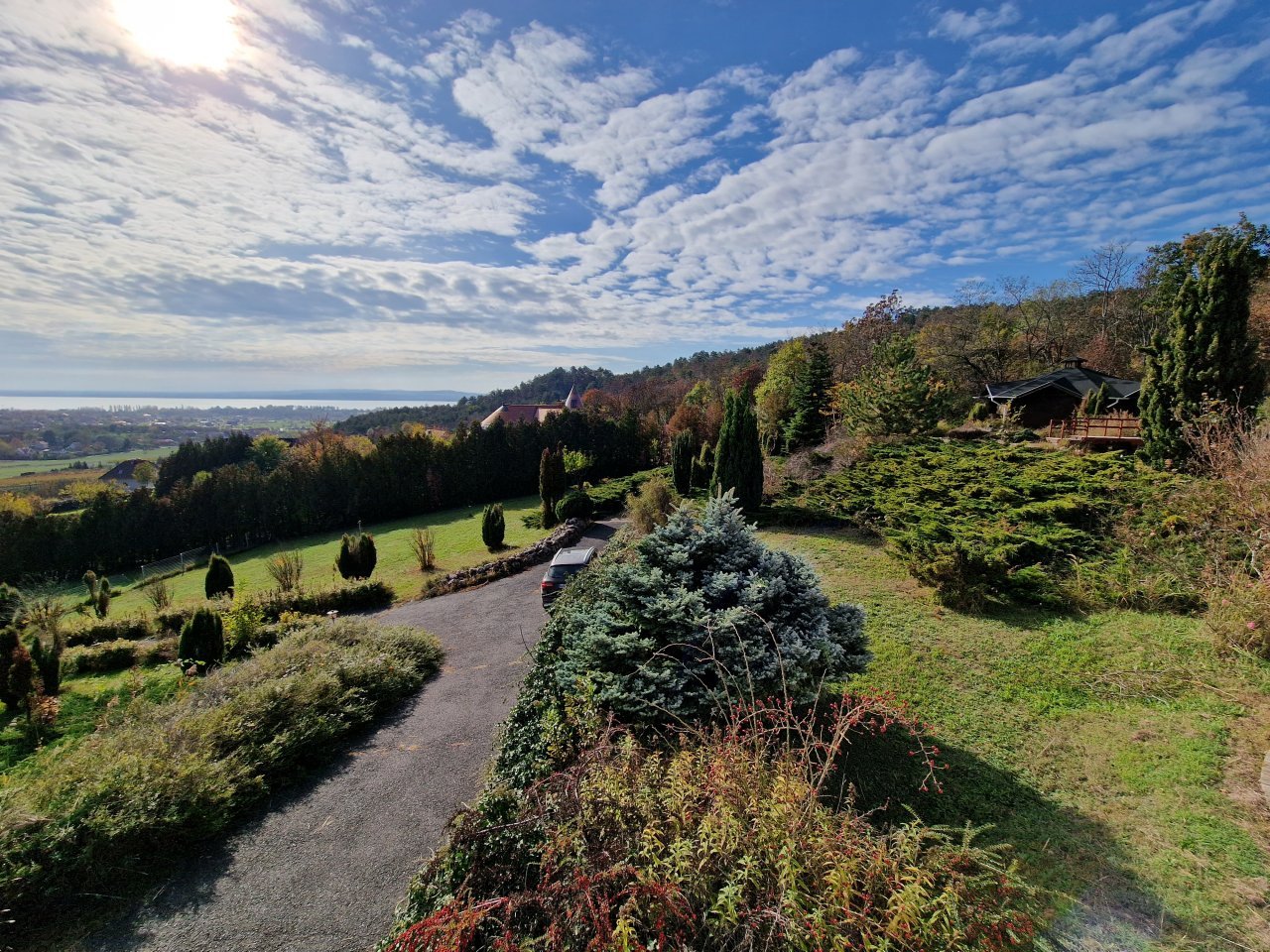 Az erőteljes bejárat már meghatározza az impozáns épületet, a balatoni kilátás pedig lélegzetelállító.