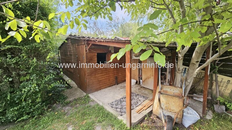 Nebengebäude: In der Ecke des Grundstücks befindet sich ein Holzhaus, das derzeit als Werkzeugschuppen dient, sowie ein Wohnwagen, der ebenfalls im Kaufpreis enthalten ist.