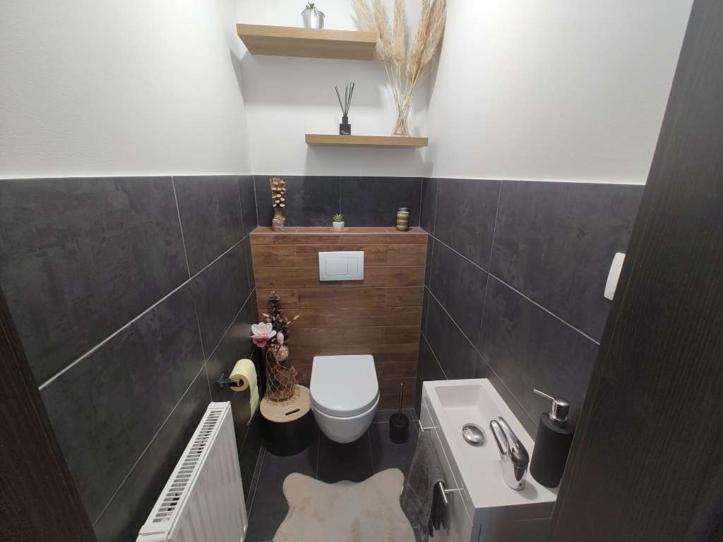 A fő hálószobában egy praktikus, különálló gardrób található. A fürdőszobában széles, akadálymentesített zuhanyzó és kényelmes fürdőkád, valamint mosdó található. A WC külön helyiségben található. Van még egy háztartási helyiség és egy kis vendég-/gyerekszoba vagy dolgozószoba is.