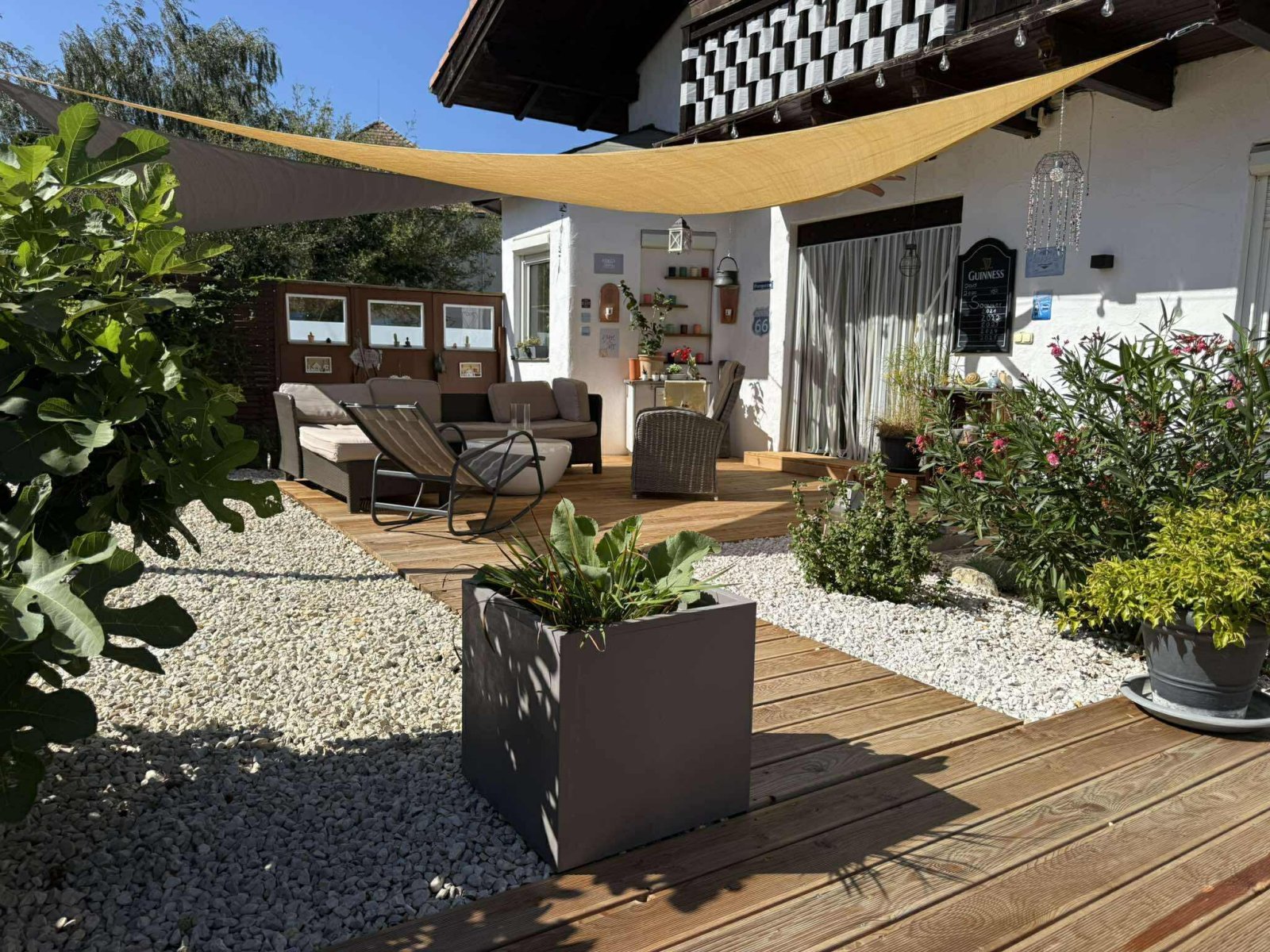 - 3 tágas terasz, amelyek közül az egyik közvetlenül a tóra néz