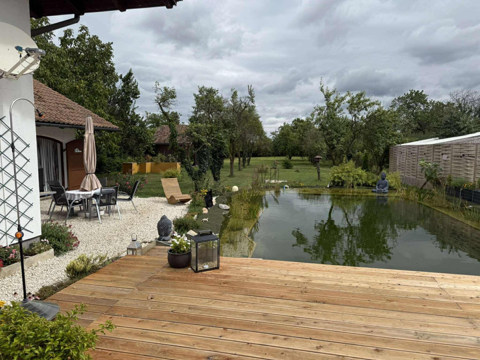 - Kerített, félreeső telek gyönyörűen parkosított kerttel, gyümölcsfákkal és egy nagy természetes medencével (12 x 6 m, átlátszó, biofilterrel)