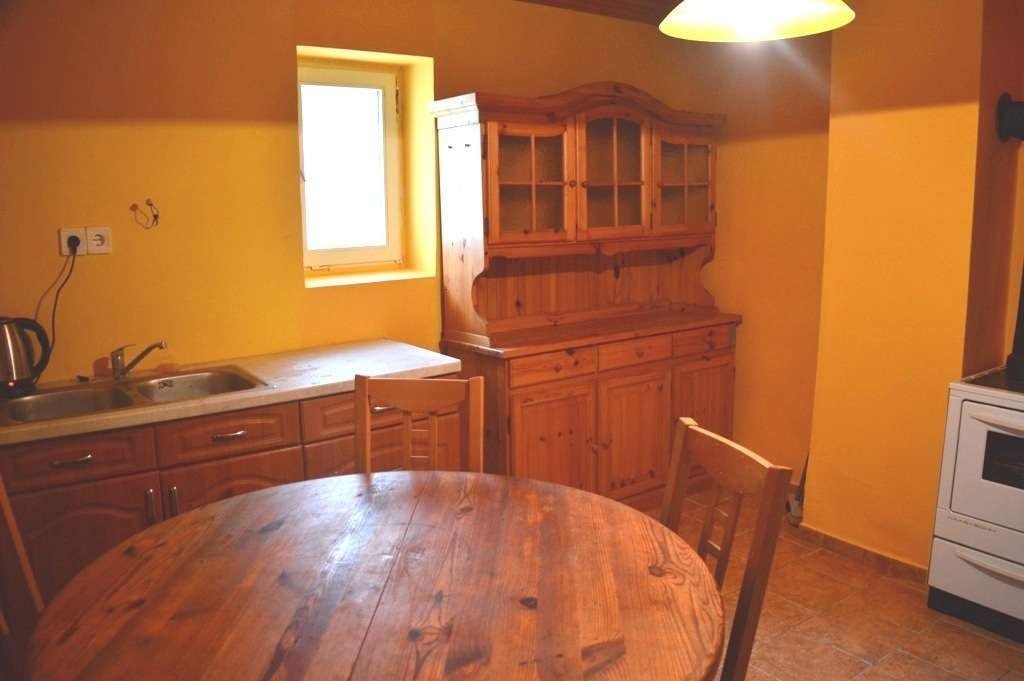 Konyha: 15 m², asztali tűzhely, tálalószekrény, mosogató, tölgyfa asztal.