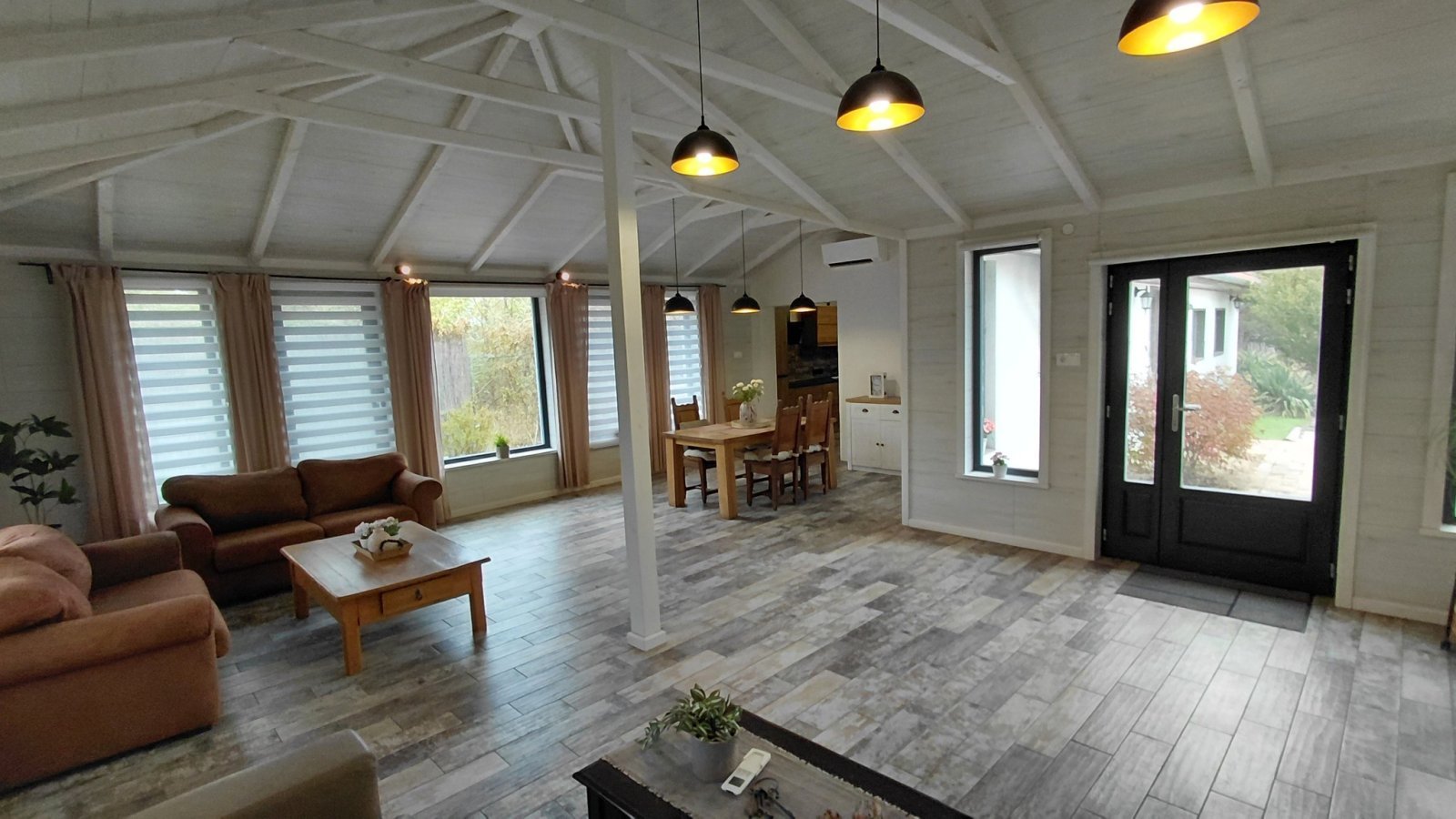 A folyosó és a nappali is a tágas, modern és teljesen felszerelt konyhába nyílik. Van még egy nagy, körülbelül 55 m²-es, magas belmagasságú szoba is. Ennek a világos szobának mindkét oldalán ajtók vezetnek kifelé. Jelenleg étkezőként és második nappaliként használják. A lehetőségek azonban végtelenek. Kialakíthat itt két további hálószobát, egy tantermet, egy gyakorlótermet vagy egy művészműtermet. Vagy mit szólna ahhoz, ha az első nappalit egy nagy, saját fürdőszobával rendelkező hálószobaként használná? Engedje szabadjára a fantáziáját.