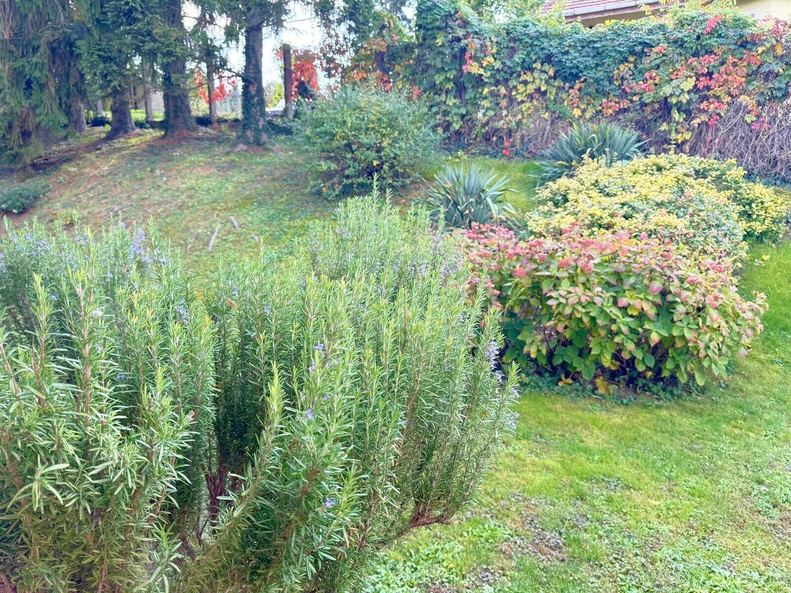 Der Garten ist gepflegt und liebevoll angelegt, mit Steingarten, vielen immergrünen Pflanzen und einem überdachten Stellplatz.